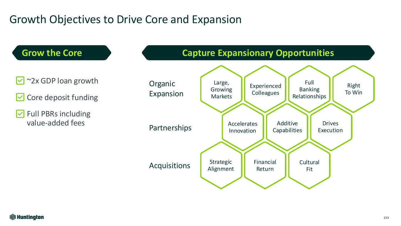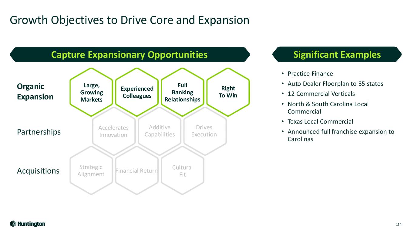 Growth Objectives to Drive Core and Expansion 133 ~2x GDP loan growth Core deposit funding Full PBRs including value-added fees Grow the Core Large, Growing Markets Full Banking Relationships Right To Win Financial Return Additive Capabilities Drives Execution Strategic Alignment Experienced Colleagues Accelerates Innovation Cultural Fit Organic Expansion Partnerships Acquisitions Capture Expansionary Opportunities