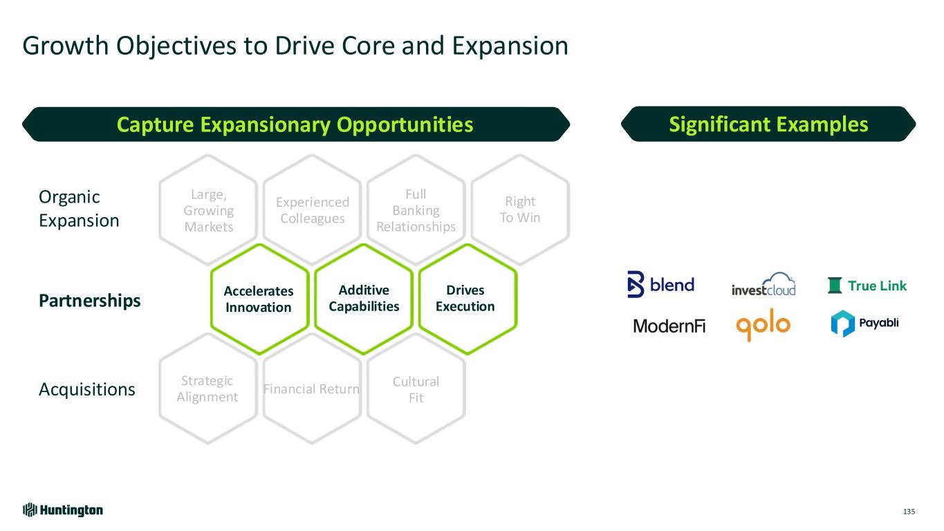 Growth Objectives to Drive Core and Expansion 134 • Practice Finance • Auto Dealer Floorplan to 35 states • 12 Commercial Verticals • North & South Carolina Local Commercial • Texas Local Commercial • Announced full franchise expansion to Carolinas Large, Growing Markets Full Banking Relationships Right To Win Financial Return Additive Capabilities Drives Execution Strategic Alignment Experienced Colleagues Accelerates Innovation Cultural Fit Organic Expansion Partnerships Acquisitions Capture Expansionary Opportunities Significant Examples