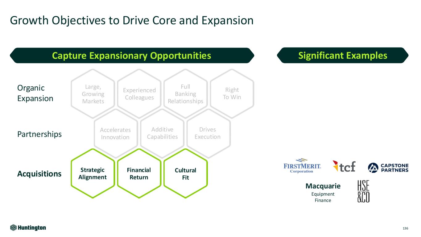 Growth Objectives to Drive Core and Expansion 135 Large, Growing Markets Full Banking Relationships Right To Win Financial Return Additive Capabilities Drives Execution Strategic Alignment Experienced Colleagues Accelerates Innovation Cultural Fit Organic Expansion Partnerships Acquisitions Capture Expansionary Opportunities Significant Examples