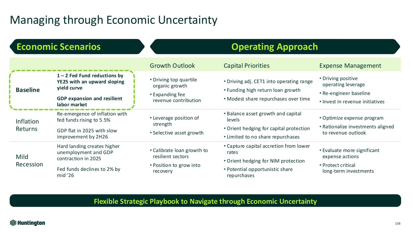 Managing through Economic Uncertainty 138 Flexible Strategic Playbook to Navigate through Economic Uncertainty Growth Outlook Capital Priorities Expense Management Baseline 1 – 2 Fed Fund reductions by YE25 with an upward sloping yield curve GDP expansion and resilient labor market • Driving top quartile organic growth • Expanding fee revenue contribution • Driving adj. CET1 into operating range • Funding high return loan growth • Modest share repurchases over time • Driving positive operating leverage • Re-engineer baseline • Invest in revenue initiatives Inflation Returns Re-emergence of inflation with fed funds rising to 5.5% GDP flat in 2025 with slow improvement by 2H26 • Leverage position of strength • Selective asset growth • Balance asset growth and capital levels • Orient hedging for capital protection • Limited to no share repurchases • Optimize expense program • Rationalize investments aligned to revenue outlook Mild Recession Hard landing creates higher unemployment and GDP contraction in 2025 Fed funds declines to 2% by mid ’26 • Calibrate loan growth to resilient sectors • Position to grow into recovery • Capture capital accretion from lower rates • Orient hedging for NIM protection • Potential opportunistic share repurchases • Evaluate more significant expense actions • Protect critical long-term investments Economic Scenarios Operating Approach