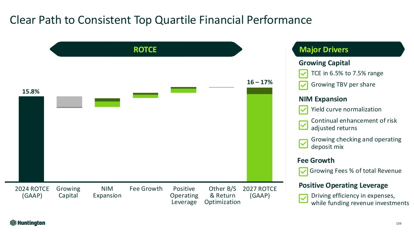 Clear Path to Consistent Top Quartile Financial Performance 139 ROTCE Major Drivers Growing Capital ✓TCE in 6.5% to 7.5% range ✓Growing TBV per share NIM Expansion ✓Yield curve normalization ✓Continual enhancement of risk adjusted returns ✓Growing checking and operating deposit mix Fee Growth ✓Growing Fees % of total Revenue Positive Operating Leverage ✓Driving efficiency in expenses, while funding revenue investments 15.8% 16 – 17% 2024 ROTCE (GAAP) 2027 ROTCE (GAAP) Growing Capital NIM Expansion Fee Growth Positive Operating Leverage Other B/S & Return Optimization