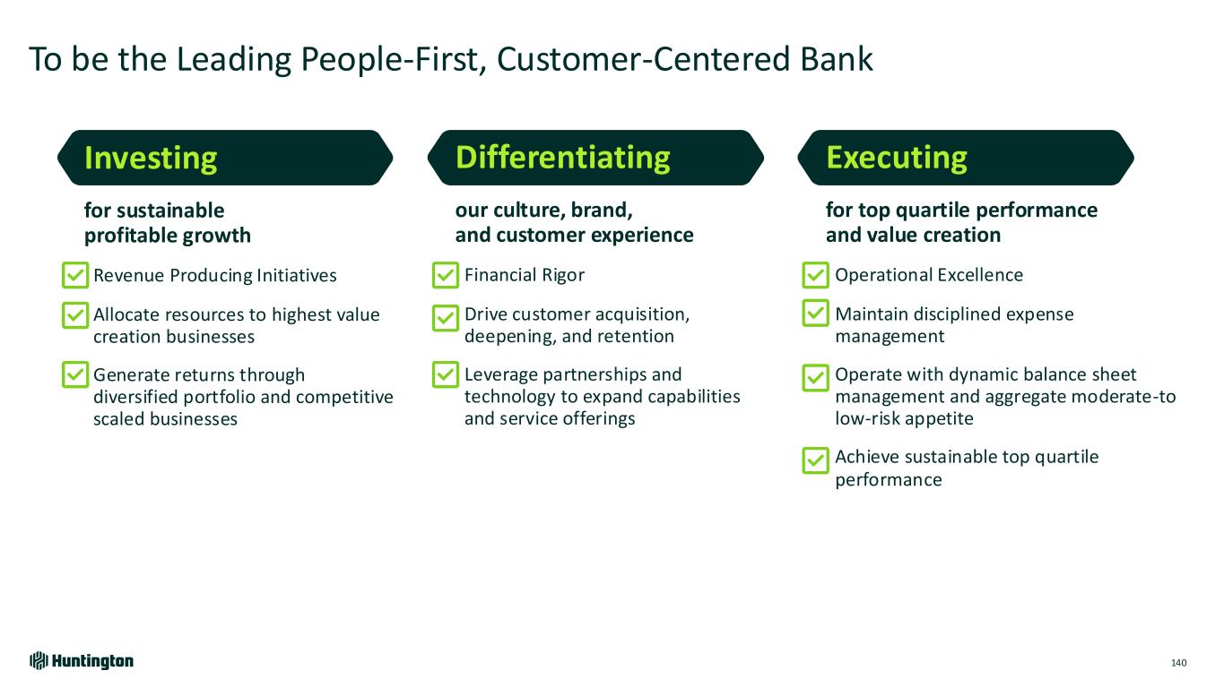 To be the Leading People-First, Customer-Centered Bank 140 Differentiating our culture, brand, and customer experience Financial Rigor Drive customer acquisition, deepening, and retention Leverage partnerships and technology to expand capabilities and service offerings Executing for top quartile performance and value creation Operational Excellence Maintain disciplined expense management Operate with dynamic balance sheet management and aggregate moderate-to low-risk appetite Achieve sustainable top quartile performance Investing for sustainable profitable growth Revenue Producing Initiatives Allocate resources to highest value creation businesses Generate returns through diversified portfolio and competitive scaled businesses