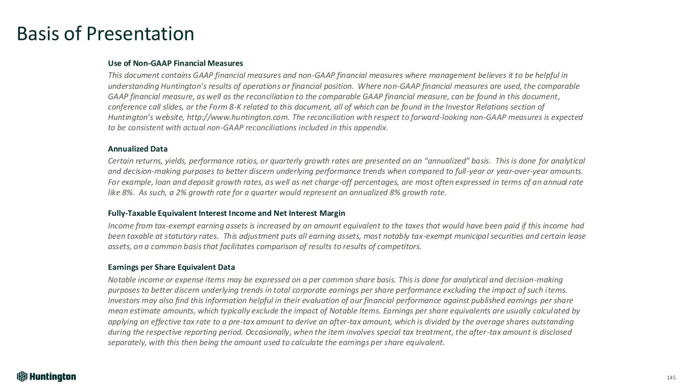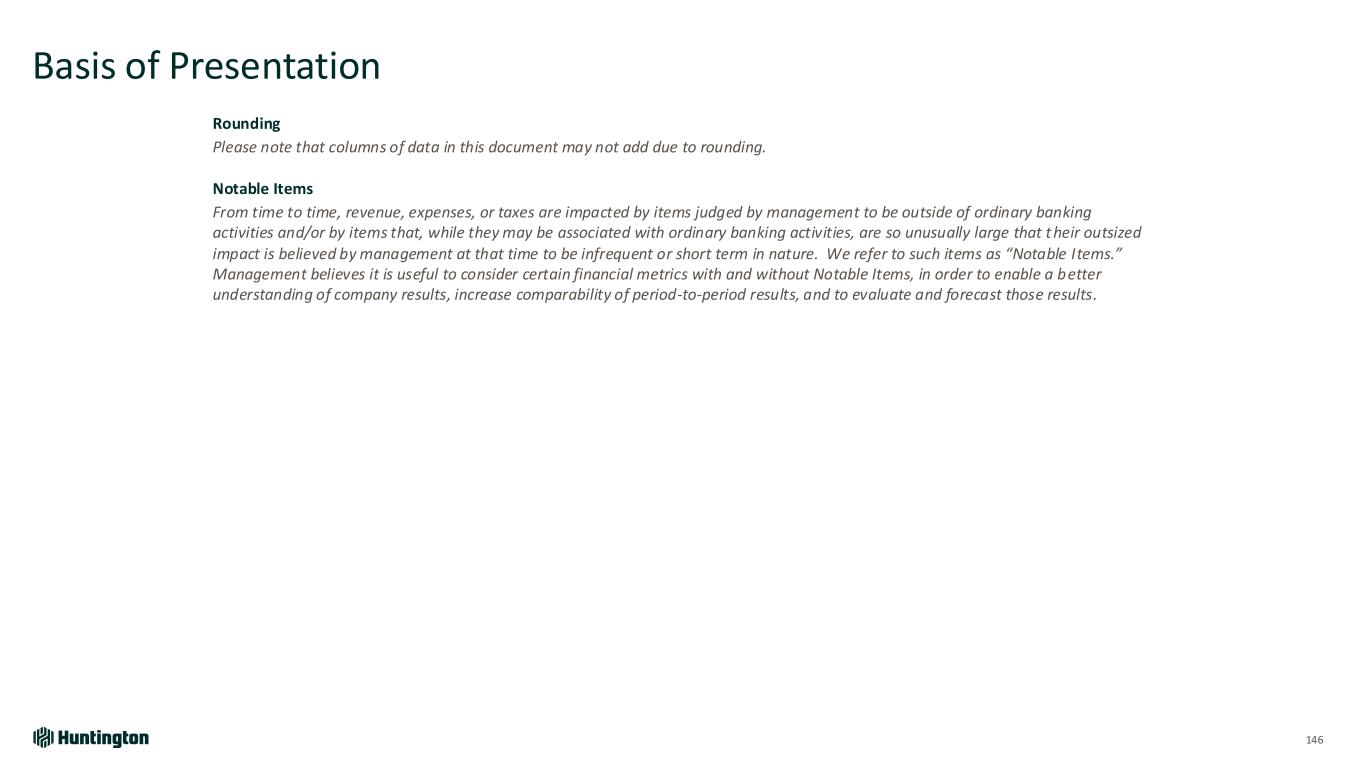 Basis of Presentation 145 Use of Non-GAAP Financial Measures This document contains GAAP financial measures and non-GAAP financial measures where management believes it to be helpful in understanding Huntington’s results of operations or financial position. Where non-GAAP financial measures are used, the comparable GAAP financial measure, as well as the reconciliation to the comparable GAAP financial measure, can be found in this document, conference call slides, or the Form 8-K related to this document, all of which can be found in the Investor Relations section of Huntington’s website, http://www.huntington.com. The reconciliation with respect to forward-looking non-GAAP measures is expected to be consistent with actual non-GAAP reconciliations included in this appendix. Annualized Data Certain returns, yields, performance ratios, or quarterly growth rates are presented on an “annualized” basis. This is done for analytical and decision-making purposes to better discern underlying performance trends when compared to full-year or year-over-year amounts. For example, loan and deposit growth rates, as well as net charge-off percentages, are most often expressed in terms of an annual rate like 8%. As such, a 2% growth rate for a quarter would represent an annualized 8% growth rate. Fully-Taxable Equivalent Interest Income and Net Interest Margin Income from tax-exempt earning assets is increased by an amount equivalent to the taxes that would have been paid if this income had been taxable at statutory rates. This adjustment puts all earning assets, most notably tax-exempt municipal securities and certain lease assets, on a common basis that facilitates comparison of results to results of competitors. Earnings per Share Equivalent Data Notable income or expense items may be expressed on a per common share basis. This is done for analytical and decision-making purposes to better discern underlying trends in total corporate earnings per share performance excluding the impact of such items. Investors may also find this information helpful in their evaluation of our financial performance against published earnings per share mean estimate amounts, which typically exclude the impact of Notable Items. Earnings per share equivalents are usually calculated by applying an effective tax rate to a pre-tax amount to derive an after-tax amount, which is divided by the average shares outstanding during the respective reporting period. Occasionally, when the item involves special tax treatment, the after-tax amount is disclosed separately, with this then being the amount used to calculate the earnings per share equivalent.