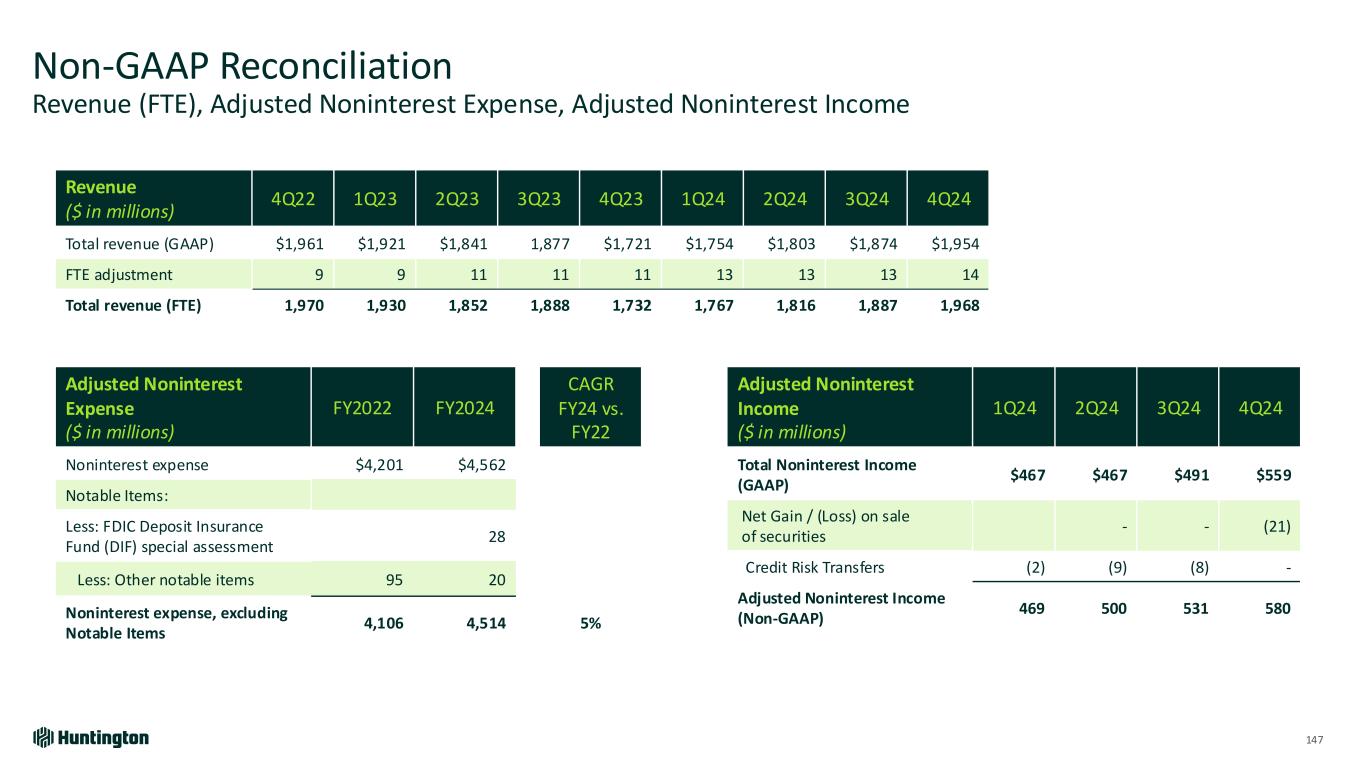 Non-GAAP Reconciliation Revenue (FTE), Adjusted Noninterest Expense, Adjusted Noninterest Income 147 Revenue ($ in millions) 4Q22 1Q23 2Q23 3Q23 4Q23 1Q24 2Q24 3Q24 4Q24 Total revenue (GAAP) $1,961 $1,921 $1,841 1,877 $1,721 $1,754 $1,803 $1,874 $1,954 FTE adjustment 9 9 11 11 11 13 13 13 14 Total revenue (FTE) 1,970 1,930 1,852 1,888 1,732 1,767 1,816 1,887 1,968 Adjusted Noninterest Expense ($ in millions) FY2022 FY2024 CAGR FY24 vs. FY22 Noninterest expense $4,201 $4,562 Notable Items: Less: FDIC Deposit Insurance Fund (DIF) special assessment 28 Less: Other notable items 95 20 Noninterest expense, excluding Notable Items 4,106 4,514 5% Adjusted Noninterest Income ($ in millions) 1Q24 2Q24 3Q24 4Q24 Total Noninterest Income (GAAP) $467 $467 $491 $559 Net Gain / (Loss) on sale of securities - - (21) Credit Risk Transfers (2) (9) (8) - Adjusted Noninterest Income (Non-GAAP) 469 500 531 580