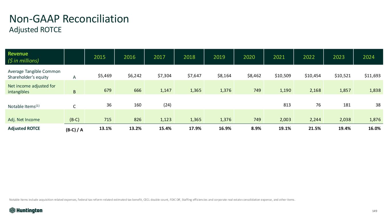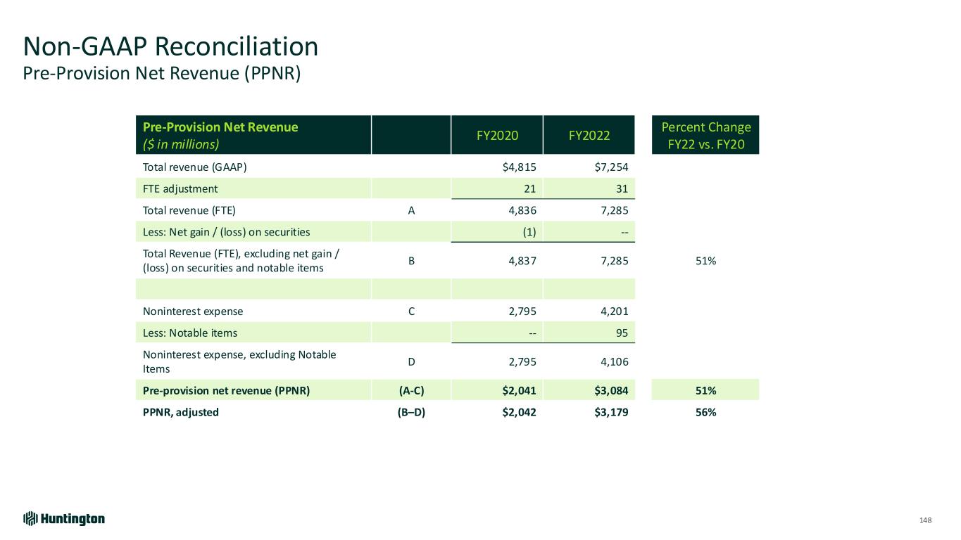 Non-GAAP Reconciliation Pre-Provision Net Revenue (PPNR) 148 Pre-Provision Net Revenue ($ in millions) FY2020 FY2022 Percent Change FY22 vs. FY20 Total revenue (GAAP) $4,815 $7,254 FTE adjustment 21 31 Total revenue (FTE) A 4,836 7,285 Less: Net gain / (loss) on securities (1) -- Total Revenue (FTE), excluding net gain / (loss) on securities and notable items B 4,837 7,285 51% Noninterest expense C 2,795 4,201 Less: Notable items -- 95 Noninterest expense, excluding Notable Items D 2,795 4,106 Pre-provision net revenue (PPNR) (A-C) $2,041 $3,084 51% PPNR, adjusted (B–D) $2,042 $3,179 56%
