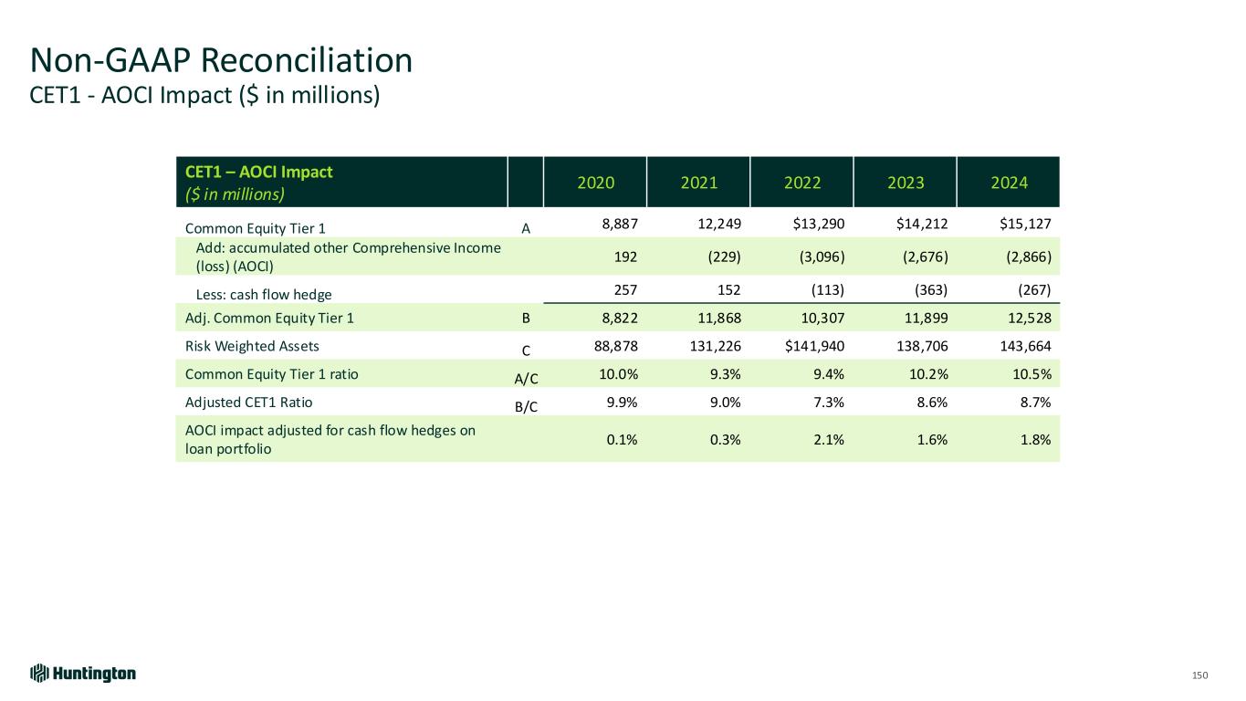 Non-GAAP Reconciliation CET1 - AOCI Impact ($ in millions) 150 CET1 – AOCI Impact ($ in millions) 2020 2021 2022 2023 2024 Common Equity Tier 1 A 8,887 12,249 $13,290 $14,212 $15,127 Add: accumulated other Comprehensive Income (loss) (AOCI) 192 (229) (3,096) (2,676) (2,866) Less: cash flow hedge 257 152 (113) (363) (267) Adj. Common Equity Tier 1 B 8,822 11,868 10,307 11,899 12,528 Risk Weighted Assets C 88,878 131,226 $141,940 138,706 143,664 Common Equity Tier 1 ratio A/C 10.0% 9.3% 9.4% 10.2% 10.5% Adjusted CET1 Ratio B/C 9.9% 9.0% 7.3% 8.6% 8.7% AOCI impact adjusted for cash flow hedges on loan portfolio 0.1% 0.3% 2.1% 1.6% 1.8%