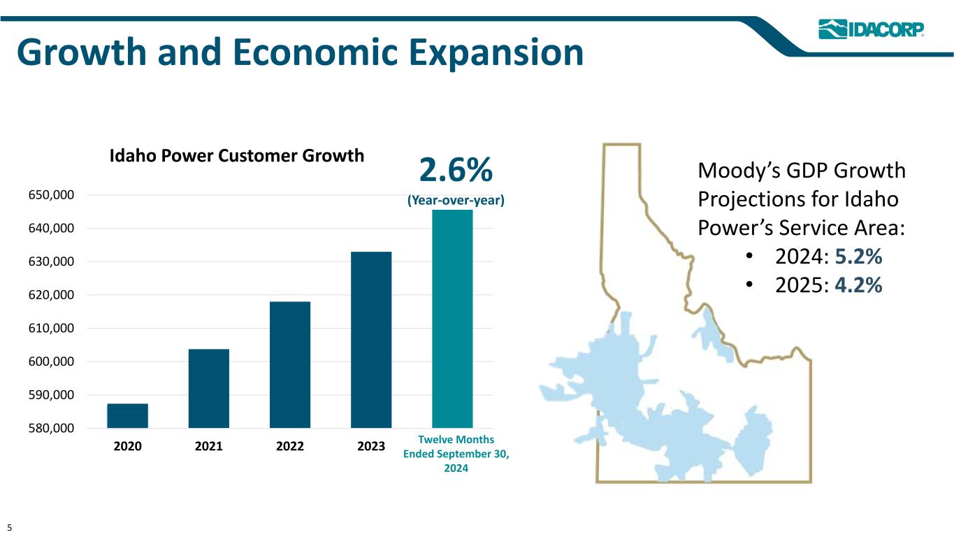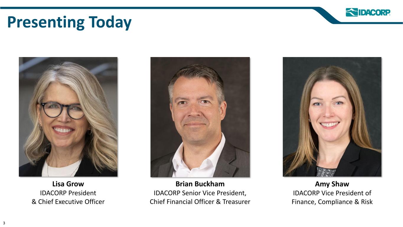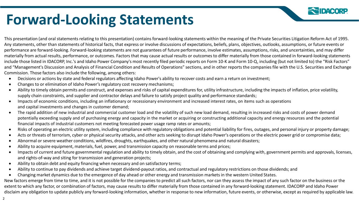 Forward-Looking Statements This presentation (and oral statements relating to this presentation) contains forward-looking statements within the meaning of the Private Securities Litigation Reform Act of 1995. Any statements, other than statements of historical facts, that express or involve discussions of expectations, beliefs, plans, objectives, outlooks, assumptions, or future events or performance are forward-looking. Forward-looking statements are not guarantees of future performance, involve estimates, assumptions, risks, and uncertainties, and may differ materially from actual results, performance, or outcomes. Factors that may cause actual results or outcomes to differ materially from those contained in forward-looking statements include those listed in IDACORP, Inc.'s and Idaho Power Company's most recently filed periodic reports on Form 10-K and Form 10-Q, including (but not limited to) the “Risk Factors” and “Management's Discussion and Analysis of Financial Condition and Results of Operations” sections, and in other reports the companies file with the U.S. Securities and Exchange Commission. Those factors also include the following, among others: • Decisions or actions by state and federal regulators affecting Idaho Power's ability to recover costs and earn a return on investment; • Changes to or elimination of Idaho Power’s regulatory cost recovery mechanisms; • Ability to timely obtain permits and construct, and expenses and risks of capital expenditures for, utility infrastructure, including the impacts of inflation, price volatility, supply chain constraints, and supplier and contractor delays and failure to satisfy project quality and performance standards; • Impacts of economic conditions, including an inflationary or recessionary environment and increased interest rates, on items such as operations and capital investments and changes in customer demand; • The rapid addition of new industrial and commercial customer load and the volatility of such new load demand, resulting in increased risks and costs of power demand potentially exceeding supply and of purchasing energy and capacity in the market or acquiring or constructing additional capacity and energy resources and the potential financial impacts of industrial customers not meeting forecasted power usage ramp rates or amounts; • Risks of operating an electric utility system, including compliance with regulatory obligations and potential liability for fires, outages, and personal injury or property damage; • Acts or threats of terrorism, cyber or physical security attacks, and other acts seeking to disrupt Idaho Power's operations or the electric power grid or compromise data; • Abnormal or severe weather conditions, wildfires, droughts, earthquakes, and other natural phenomena and natural disasters; • Ability to acquire equipment, materials, fuel, power, and transmission capacity on reasonable terms and prices; • Impacts of current and future governmental regulation and ability to timely obtain, and the cost of obtaining and complying with, government permits and approvals, licenses, and rights-of-way and siting for transmission and generation projects; • Ability to obtain debt and equity financing when necessary and on satisfactory terms; • Ability to continue to pay dividends and achieve target dividend-payout ratios, and contractual and regulatory restrictions on those dividends; and • Changing market dynamics due to the emergence of day ahead or other energy and transmission markets in the western United States. New factors emerge from time to time, and it is not possible for the companies to predict all such factors, nor can they assess the impact of any such factor on the business or the extent to which any factor, or combination of factors, may cause results to differ materially from those contained in any forward-looking statement. IDACORP and Idaho Power disclaim any obligation to update publicly any forward-looking information, whether in response to new information, future events, or otherwise, except as required by applicable law. 2