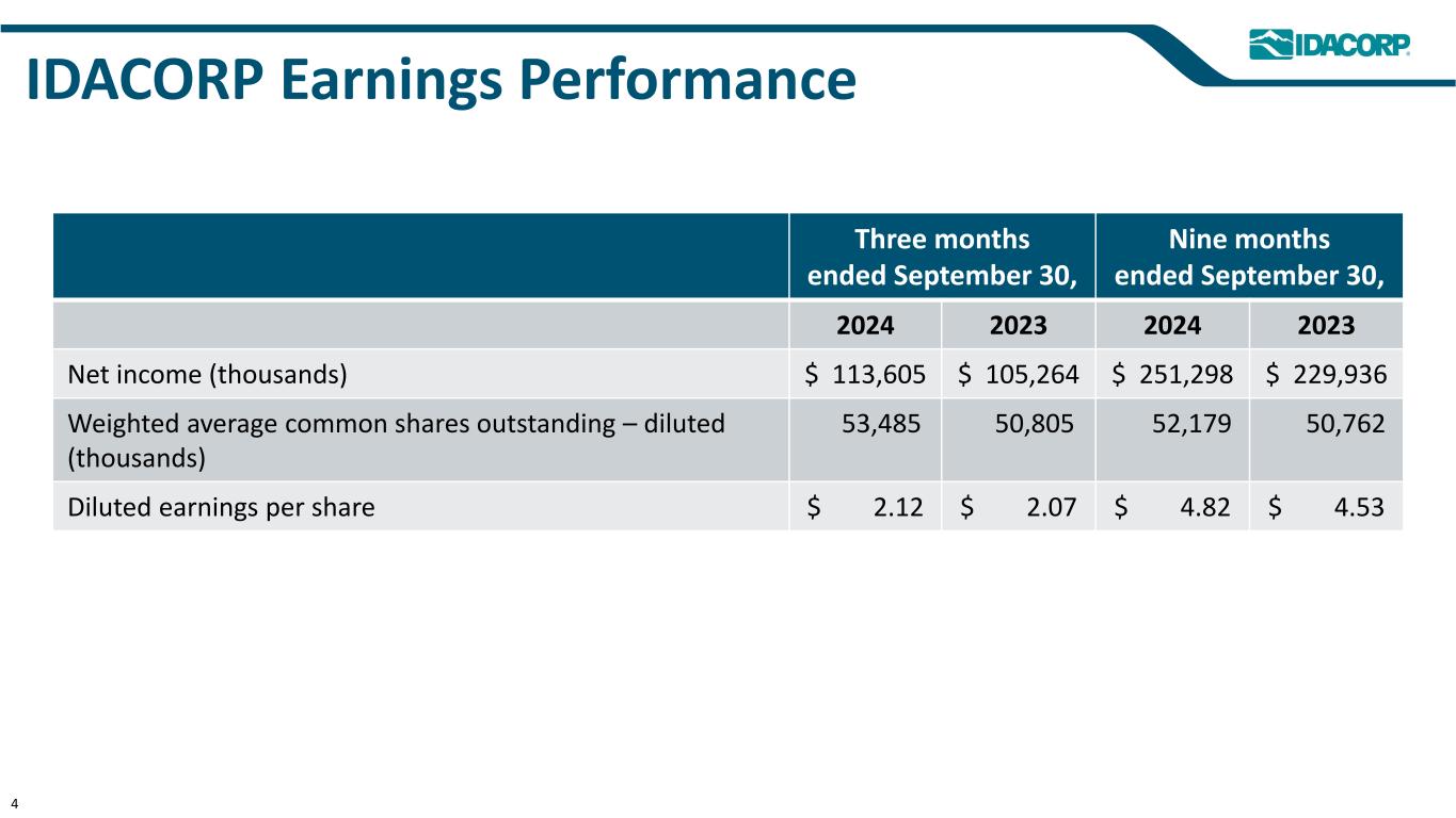 IDACORP Earnings Performance Three months ended September 30, Nine months ended September 30, 2024 2023 2024 2023 Net income (thousands) $ 113,605 $ 105,264 $ 251,298 $ 229,936 Weighted average common shares outstanding – diluted (thousands) 53,485 50,805 52,179 50,762 Diluted earnings per share $ 2.12 $ 2.07 $ 4.82 $ 4.53 4