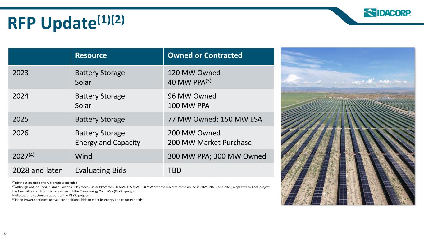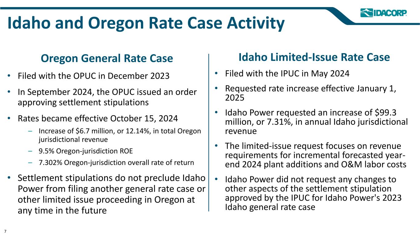 RFP Update(1)(2) Resource Owned or Contracted 2023 Battery Storage Solar 120 MW Owned 40 MW PPA(3) 2024 Battery Storage Solar 96 MW Owned 100 MW PPA 2025 Battery Storage 77 MW Owned; 150 MW ESA 2026 Battery Storage Energy and Capacity 200 MW Owned 200 MW Market Purchase 2027(4) Wind 300 MW PPA; 300 MW Owned 2028 and later Evaluating Bids TBD 6 (1)Distribution site battery storage is excluded. (2)Although not included in Idaho Power’s RFP process, solar PPA's for 200 MW, 125 MW, 320 MW are scheduled to come online in 2025, 2026, and 2027, respectively. Each project has been allocated to customers as part of the Clean Energy Your Way (CEYW) program. (3)Allocated to customers as part of the CEYW program. (4)Idaho Power continues to evaluate additional bids to meet its energy and capacity needs.