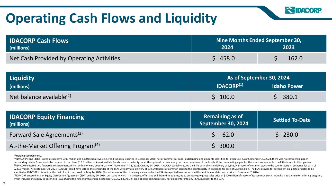Liquidity (millions) As of September 30, 2024 IDACORP(1) Idaho Power Net balance available(2) $ 100.0 $ 380.1 Operating Cash Flows and Liquidity (1) Holding company only. (2) IDACORP’s and Idaho Power’s respective $100 million and $400 million revolving credit facilities, expiring in December 2028, net of commercial paper outstanding and amounts identified for other use. As of September 30, 2024, there was no commercial paper outstanding. Idaho Power could be required to purchase $19.8 million of American Falls Bonds prior to maturity under the optional or mandatory purchase provisions of the bonds, if the remarketing agent for the bonds were unable to sell the bonds to third parties. (3) IDACORP entered two forward sale agreements (FSAs) with a forward counterparty on November 7 & 8, 2023. On May 14, 2024, IDACORP partially settled the FSAs with physical delivery of 2,542,442 shares of common stock to the counterparty in exchange for cash of $230.0 million. At September 30, 2024, IDACORP could have settled the remainder of the FSAs with physical delivery of 679,540 shares of common stock to the counterparty in exchange for cash of $62.0 million. The FSAs provide for settlement on a date or dates to be specified at IDACORP’s discretion, the first of which occurred on May 14, 2024. The settlement of the remaining shares under the FSAs is expected to occur on a settlement date or dates on or prior to November 7, 2024. (4) IDACORP entered into an Equity Distribution Agreement (EDA) on May 20, 2024, pursuant to which it may issue, offer, and sell, from time to time, up to an aggregate gross sales price of $300 million of shares of its common stock through an at-the-market offering program, which includes the ability to enter into FSAs. During the nine months ended September 30, 2024, IDACORP did not issue common stock, nor did it enter into any FSAs, pursuant to the EDA. 9 IDACORP Cash Flows (millions) Nine Months Ended September 30, 2024 2023 Net Cash Provided by Operating Activities $ 458.0 $ 162.0 IDACORP Equity Financing (millions) Remaining as of September 30, 2024 Settled To-Date Forward Sale Agreements(3) $ 62.0 $ 230.0 At-the-Market Offering Program(4) $ 300.0 –