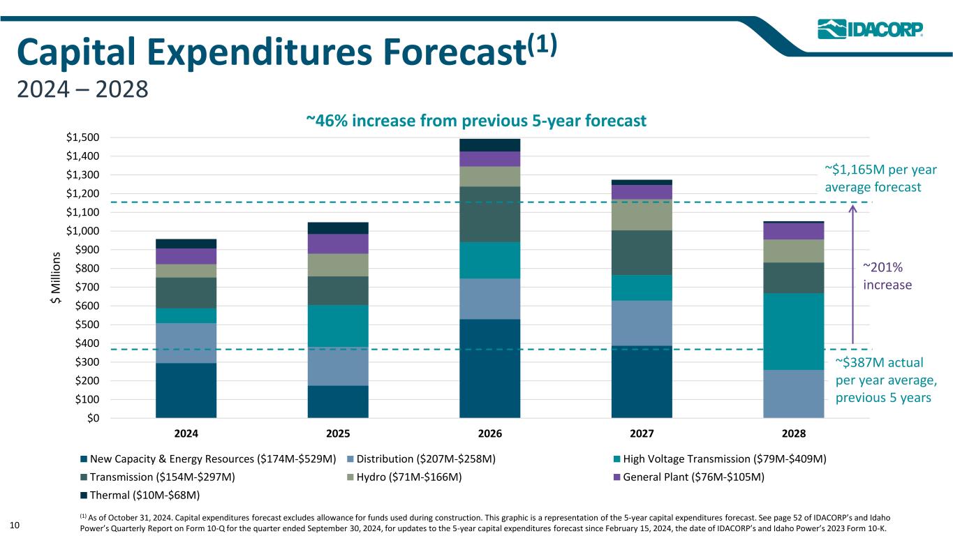 Capital Expenditures Forecast(1) 2024 – 2028 $0 $100 $200 $300 $400 $500 $600 $700 $800 $900 $1,000 $1,100 $1,200 $1,300 $1,400 $1,500 2024 2025 2026 2027 2028 $ M ill io n s New Capacity & Energy Resources ($174M-$529M) Distribution ($207M-$258M) High Voltage Transmission ($79M-$409M) Transmission ($154M-$297M) Hydro ($71M-$166M) General Plant ($76M-$105M) Thermal ($10M-$68M) (1) As of October 31, 2024. Capital expenditures forecast excludes allowance for funds used during construction. This graphic is a representation of the 5-year capital expenditures forecast. See page 52 of IDACORP’s and Idaho Power’s Quarterly Report on Form 10-Q for the quarter ended September 30, 2024, for updates to the 5-year capital expenditures forecast since February 15, 2024, the date of IDACORP’s and Idaho Power’s 2023 Form 10-K. ~46% increase from previous 5-year forecast ~$387M actual per year average, previous 5 years ~201% increase ~$1,165M per year average forecast 10