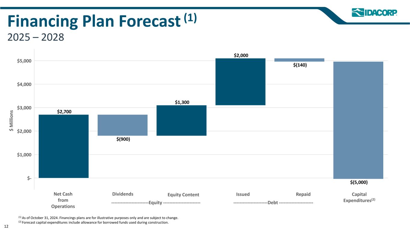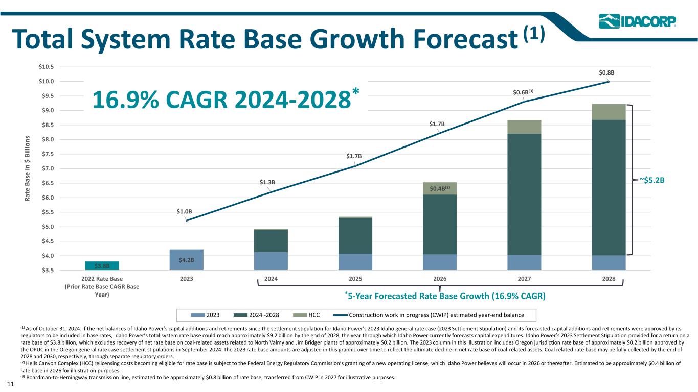 $3.8B $4.2B $0.4B(2) $1.0B $1.3B $1.7B $1.7B $0.6B(3) $0.8B $3.5 $4.0 $4.5 $5.0 $5.5 $6.0 $6.5 $7.0 $7.5 $8.0 $8.5 $9.0 $9.5 $10.0 $10.5 2022 Rate Base (Prior Rate Base CAGR Base Year) 2023 2024 2025 2026 2027 2028 R at e B as e in $ B ill io n s 2023 2024 -2028 HCC Construction work in progress (CWIP) estimated year-end balance Total System Rate Base Growth Forecast (1) (1) As of October 31, 2024. If the net balances of Idaho Power’s capital additions and retirements since the settlement stipulation for Idaho Power's 2023 Idaho general rate case (2023 Settlement Stipulation) and its forecasted capital additions and retirements were approved by its regulators to be included in base rates, Idaho Power’s total system rate base could reach approximately $9.2 billion by the end of 2028, the year through which Idaho Power currently forecasts capital expenditures. Idaho Power’s 2023 Settlement Stipulation provided for a return on a rate base of $3.8 billion, which excludes recovery of net rate base on coal-related assets related to North Valmy and Jim Bridger plants of approximately $0.2 billion. The 2023 column in this illustration includes Oregon jurisdiction rate base of approximately $0.2 billion approved by the OPUC in the Oregon general rate case settlement stipulations in September 2024. The 2023 rate base amounts are adjusted in this graphic over time to reflect the ultimate decline in net rate base of coal-related assets. Coal related rate base may be fully collected by the end of 2028 and 2030, respectively, through separate regulatory orders. (2) Hells Canyon Complex (HCC) relicensing costs becoming eligible for rate base is subject to the Federal Energy Regulatory Commission’s granting of a new operating license, which Idaho Power believes will occur in 2026 or thereafter. Estimated to be approximately $0.4 billion of rate base in 2026 for illustration purposes. (3) Boardman-to-Hemingway transmission line, estimated to be approximately $0.8 billion of rate base, transferred from CWIP in 2027 for illustrative purposes. 16.9% CAGR 2024-2028* *5-Year Forecasted Rate Base Growth (16.9% CAGR) ~$5.2B 11