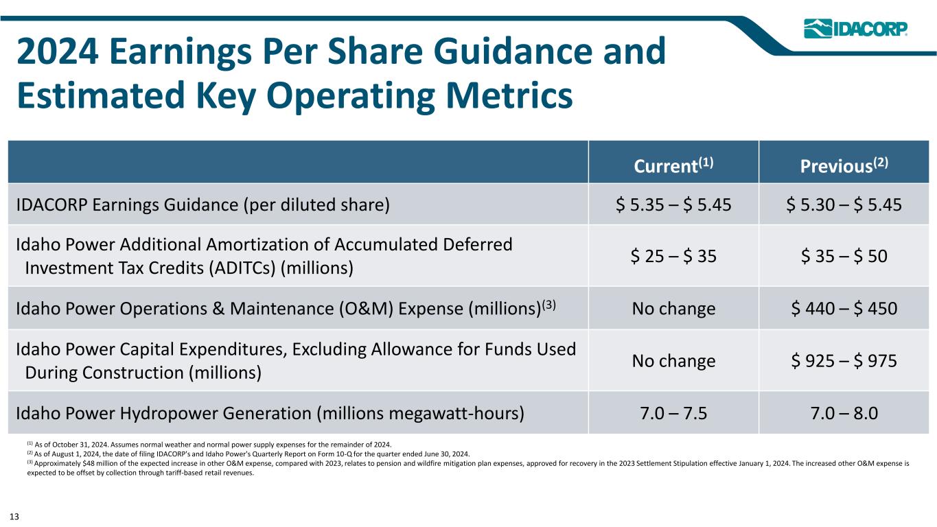 2024 Earnings Per Share Guidance and Estimated Key Operating Metrics Current(1) Previous(2) IDACORP Earnings Guidance (per diluted share) $ 5.35 – $ 5.45 $ 5.30 – $ 5.45 Idaho Power Additional Amortization of Accumulated Deferred Investment Tax Credits (ADITCs) (millions) $ 25 – $ 35 $ 35 – $ 50 Idaho Power Operations & Maintenance (O&M) Expense (millions)(3) No change $ 440 – $ 450 Idaho Power Capital Expenditures, Excluding Allowance for Funds Used During Construction (millions) No change $ 925 – $ 975 Idaho Power Hydropower Generation (millions megawatt-hours) 7.0 – 7.5 7.0 – 8.0 (1) As of October 31, 2024. Assumes normal weather and normal power supply expenses for the remainder of 2024. (2) As of August 1, 2024, the date of filing IDACORP's and Idaho Power's Quarterly Report on Form 10-Q for the quarter ended June 30, 2024. (3) Approximately $48 million of the expected increase in other O&M expense, compared with 2023, relates to pension and wildfire mitigation plan expenses, approved for recovery in the 2023 Settlement Stipulation effective January 1, 2024. The increased other O&M expense is expected to be offset by collection through tariff-based retail revenues. 13