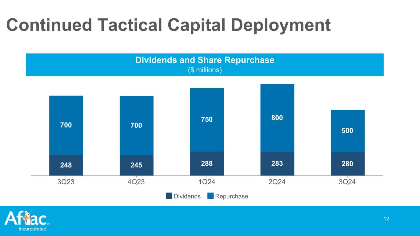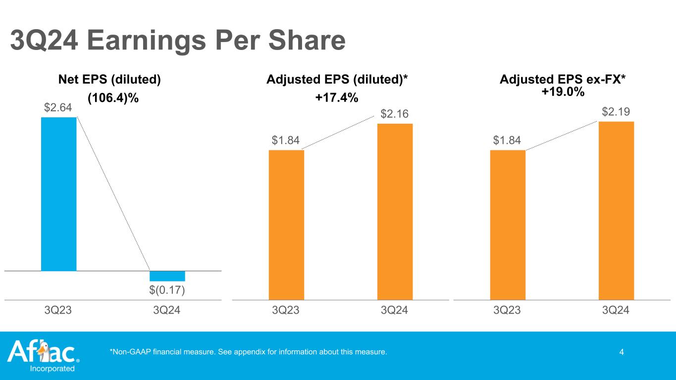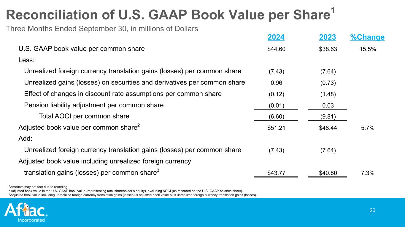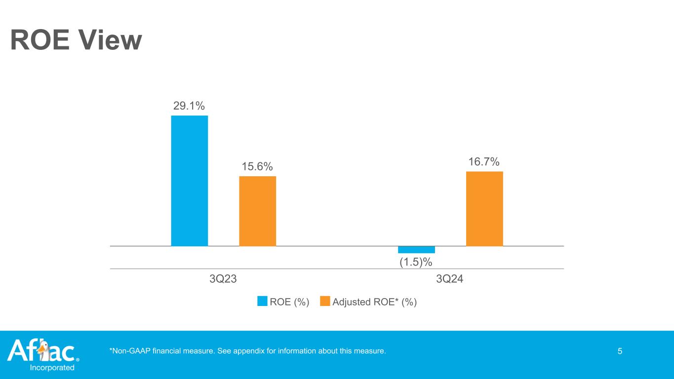 Forward-Looking Statements and Non-GAAP Financial Measures The Private Securities Litigation Reform Act of 1995 provides a “safe harbor” to encourage companies to provide prospective information, so long as those informational statements are identified as forward-looking and are accompanied by meaningful cautionary statements identifying important factors that could cause actual results to differ materially from those included in the forward-looking statements. The company desires to take advantage of these provisions. This document contains cautionary statements identifying important factors that could cause actual results to differ materially from those projected herein, and in any other statements made by company officials in communications with the financial community and contained in documents filed with the Securities and Exchange Commission (SEC). Forward-looking statements are not based on historical information and relate to future operations, strategies, financial results or other developments. Furthermore, forward-looking information is subject to numerous assumptions, risks and uncertainties. In particular, statements containing words such as “expect,” “anticipate,” “believe,” “goal,” “objective,” “may,” “should,” “estimate,” “e,” “intends,” “projects,” “will,” “assumes,” “potential,” “target,” "outlook" or similar words as well as specific projections of future results, generally qualify as forward-looking. Aflac undertakes no obligation to update such forward-looking statements. The company cautions readers that the following factors, in addition to other factors mentioned from time to time, could cause actual results to differ materially from those contemplated by the forward-looking statements: Non-U.S. GAAP Financial Measures and Reconciliations This document includes references to the Company’s financial performance measures which are not calculated in accordance with United States generally accepted accounting principles (U.S. GAAP) (non-U.S. GAAP). The financial measures exclude items that the Company believes may obscure the underlying fundamentals and trends in insurance operations because they tend to be driven by general economic conditions and events or related to infrequent activities not directly associated with insurance operations. Definitions of the Company’s non-U.S. GAAP financial measures and applicable reconciliations to the most comparable U.S. GAAP measures are provided as appropriate. Due to the size of Aflac Japan, where the functional currency is the Japanese yen, fluctuations in the yen/dollar exchange rate can have a significant effect on reported results. In periods when the yen weakens, translating yen into dollars results in fewer dollars being reported. When the yen strengthens, translating yen into dollars results in more dollars being reported. Consequently, yen weakening has the effect of suppressing current period results in relation to the comparable prior period, while yen strengthening has the effect of magnifying current period results in relation to the comparable prior period. A significant portion of the Company’s business is conducted in yen and never converted into dollars but translated into dollars for U.S. GAAP reporting purposes, which results in foreign currency impact to earnings, cash flows and book value on a U.S. GAAP basis. Management evaluates the Company's financial performance both including and excluding the impact of foreign currency translation to monitor, respectively, cumulative currency impacts and the currency-neutral operating performance over time. The average yen/dollar exchange rate is based on the published MUFG Bank, Ltd. telegraphic transfer middle rate (TTM). • difficult conditions in global capital markets and the economy, including inflation • defaults and credit downgrades of investments • global fluctuations in interest rates and exposure to significant interest rate risk • concentration of business in Japan • limited availability of acceptable yen-denominated investments • foreign currency fluctuations in the yen/dollar exchange rate • differing interpretations applied to investment valuations • significant valuation judgments in determination of expected credit losses recorded on the Company's investments • decreases in the Company's financial strength or debt ratings • decline in creditworthiness of other financial institutions • the Company's ability to attract and retain qualified sales associates, brokers, employees, and distribution partners • deviations in actual experience from pricing and reserving assumptions • ability to continue to develop and implement improvements in information technology systems and on successful execution of revenue growth and expense management initiatives • interruption in telecommunication, information technology and other operational systems, or a failure to maintain the security, confidentiality, integrity or privacy of sensitive data residing on such systems • subsidiaries' ability to pay dividends to the Parent Company • inherent limitations to risk management policies and procedures • operational risks of third-party vendors • tax rates applicable to the Company may change • failure to comply with restrictions on policyholder privacy and information security • extensive regulation and changes in law or regulation by governmental authorities • competitive environment and ability to anticipate and respond to market trends • catastrophic events, including, but not limited to, as a result of climate change, epidemics, pandemics, tornadoes, hurricanes, earthquakes, tsunamis, war or other military action, major public health issues, terrorism or other acts of violence, and damage incidental to such events • ability to protect the Aflac brand and the Company's reputation • ability to effectively manage key executive succession • changes in accoun