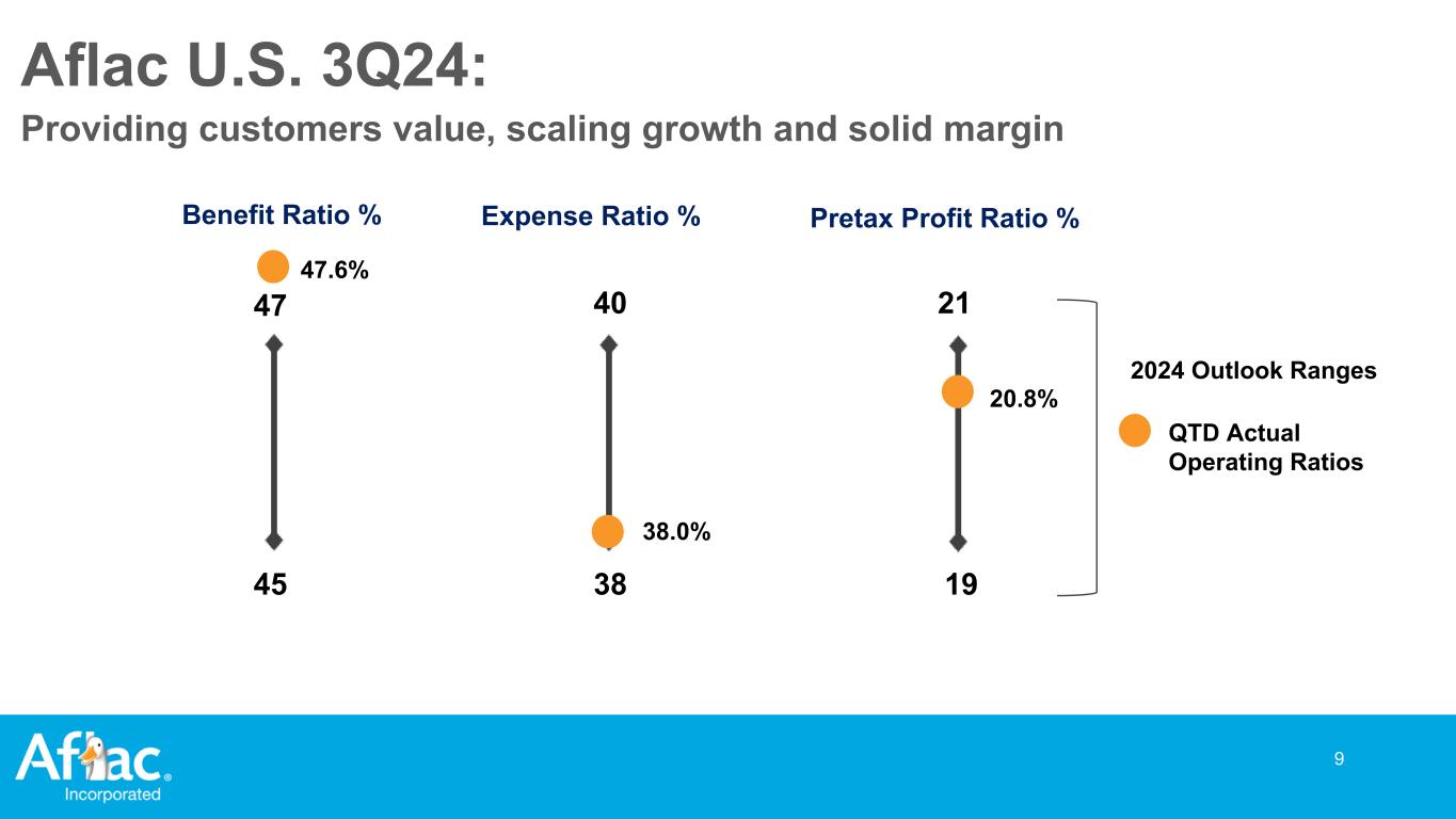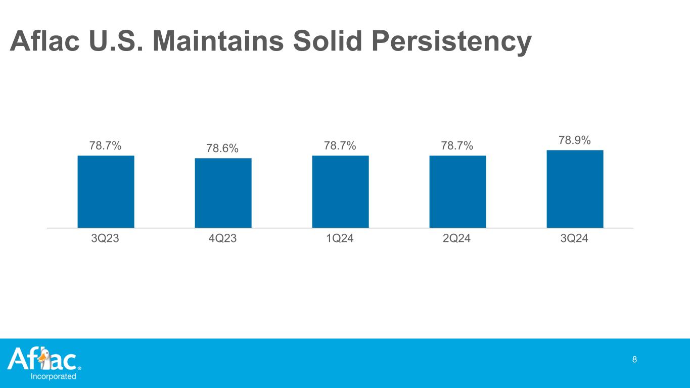 Aflac U.S. Maintains Solid Persistency 78.7% 78.6% 78.7% 78.7% 78.9% 3Q23 4Q23 1Q24 2Q24 3Q24 8