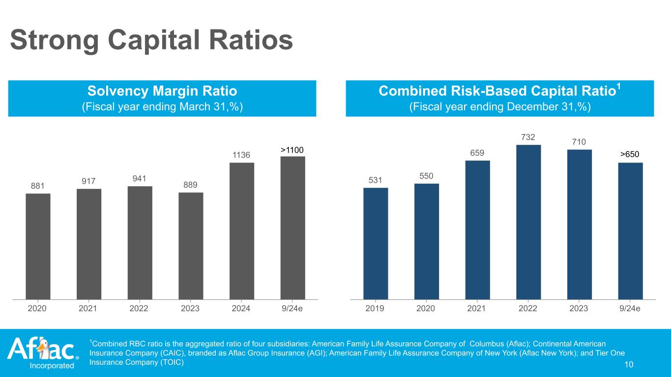 Aflac U.S. 3Q24: Providing customers value, scaling growth and solid margin Benefit Ratio % 47 45 Expense Ratio % 40 38 Pretax Profit Ratio % 21 19 47.6% 38.0% 20.8% 2024 Outlook Ranges QTD Actual Operating Ratios 9