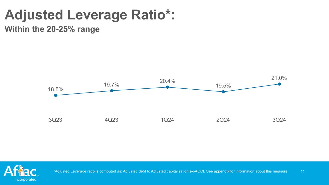 Strong Capital Ratios Solvency Margin Ratio (Fiscal year ending March 31,%) 881 917 941 889 1136 2020 2021 2022 2023 2024 9/24e Combined Risk-Based Capital Ratio1 (Fiscal year ending December 31,%) 531 550 659 732 710 2019 2020 2021 2022 2023 9/24e >650 1Combined RBC ratio is the aggregated ratio of four subsidiaries: American Family Life Assurance Company of Columbus (Aflac); Continental American Insurance Company (CAIC), branded as Aflac Group Insurance (AGI); American Family Life Assurance Company of New York (Aflac New York); and Tier One Insurance Company (TOIC) >1100 10