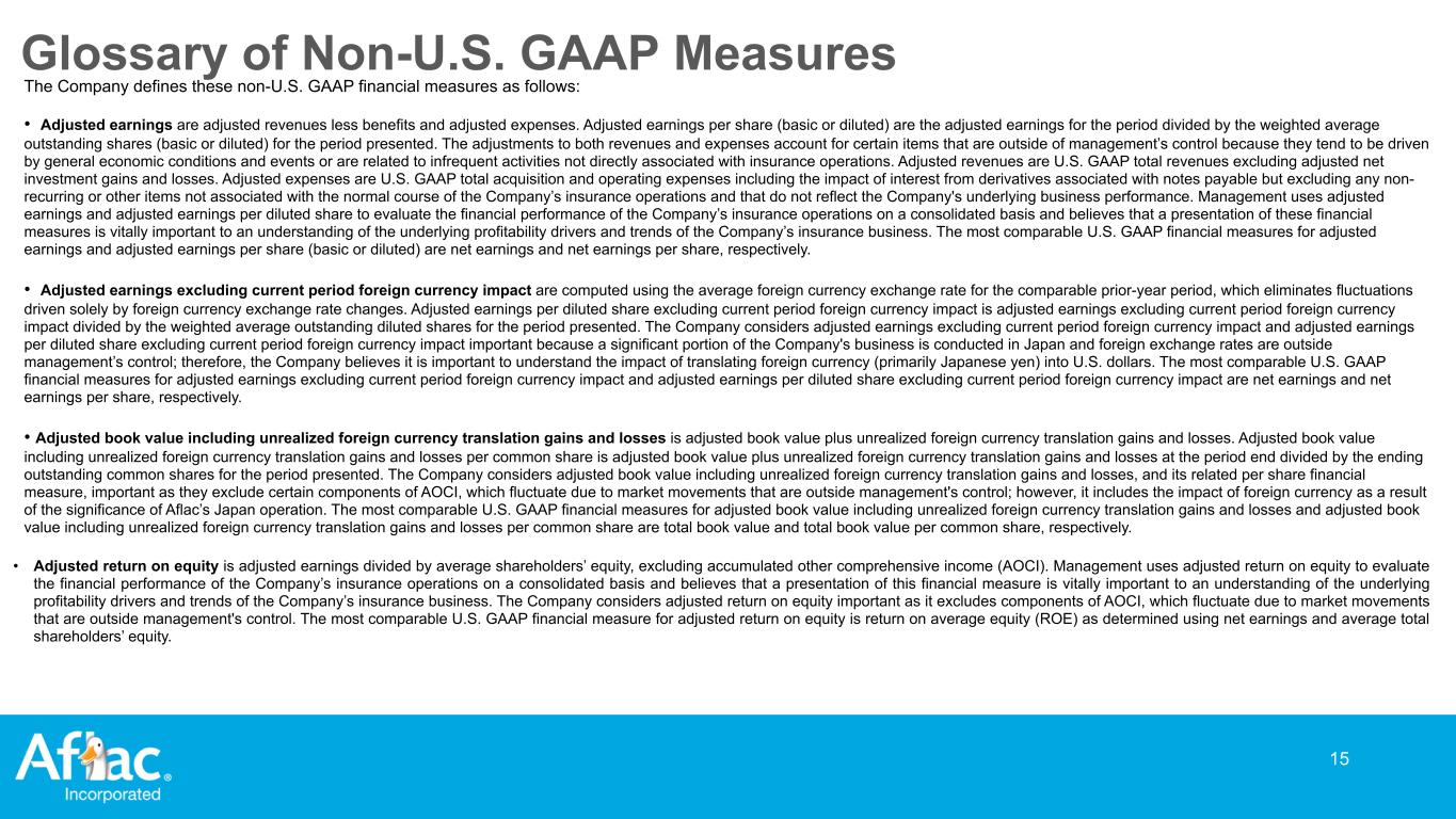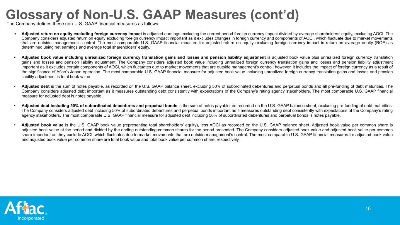 Glossary of Non-U.S. GAAP Measures The Company defines these non-U.S. GAAP financial measures as follows: • Adjusted earnings are adjusted revenues less benefits and adjusted expenses. Adjusted earnings per share (basic or diluted) are the adjusted earnings for the period divided by the weighted average outstanding shares (basic or diluted) for the period presented. The adjustments to both revenues and expenses account for certain items that are outside of management’s control because they tend to be driven by general economic conditions and events or are related to infrequent activities not directly associated with insurance operations. Adjusted revenues are U.S. GAAP total revenues excluding adjusted net investment gains and losses. Adjusted expenses are U.S. GAAP total acquisition and operating expenses including the impact of interest from derivatives associated with notes payable but excluding any non- recurring or other items not associated with the normal course of the Company’s insurance operations and that do not reflect the Company's underlying business performance. Management uses adjusted earnings and adjusted earnings per diluted share to evaluate the financial performance of the Company’s insurance operations on a consolidated basis and believes that a presentation of these financial measures is vitally important to an understanding of the underlying profitability drivers and trends of the Company’s insurance business. The most comparable U.S. GAAP financial measures for adjusted earnings and adjusted earnings per share (basic or diluted) are net earnings and net earnings per share, respectively. • Adjusted earnings excluding current period foreign currency impact are computed using the average foreign currency exchange rate for the comparable prior-year period, which eliminates fluctuations driven solely by foreign currency exchange rate changes. Adjusted earnings per diluted share excluding current period foreign currency impact is adjusted earnings excluding current period foreign currency impact divided by the weighted average outstanding diluted shares for the period presented. The Company considers adjusted earnings excluding current period foreign currency impact and adjusted earnings per diluted share excluding current period foreign currency impact important because a significant portion of the Company's business is conducted in Japan and foreign exchange rates are outside management’s control; therefore, the Company believes it is important to understand the impact of translating foreign currency (primarily Japanese yen) into U.S. dollars. The most comparable U.S. GAAP financial measures for adjusted earnings excluding current period foreign currency impact and adjusted earnings per diluted share excluding current period foreign currency impact are net earnings and net earnings per share, respectively. • Adjusted book value including unrealized foreign currency translation gains and losses is adjusted book value plus unrealized foreign currency translation gains and losses. Adjusted book value including unrealized foreign currency translation gains and losses per common share is adjusted book value plus unrealized foreign currency translation gains and losses at the period end divided by the ending outstanding common shares for the period presented. The Company considers adjusted book value including unrealized foreign currency translation gains and losses, and its related per share financial measure, important as they exclude certain components of AOCI, which fluctuate due to market movements that are outside management's control; however, it includes the impact of foreign currency as a result of the significance of Aflac’s Japan operation. The most comparable U.S. GAAP financial measures for adjusted book value including unrealized foreign currency translation gains and losses and adjusted book value including unrealized foreign currency translation gains and losses per common share are total book value and total book value per common share, respectively. • Adjusted return on equity is adjusted earnings divided by average shareholders’ equity, excluding accumulated other comprehensive income (AOCI). Management uses adjusted return on equity to evaluate the financial performance of the Company’s insurance operations on a consolidated basis and believes that a presentation of this financial measure is vitally important to an understanding of the underlying profitability drivers and trends of the Company’s insurance business. The Company considers adjusted return on equity important as it excludes components of AOCI, which fluctuate due to market movements that are outside management's control. The most comparable U.S. GAAP financial measure for adjusted return on equity is return on average equity (ROE) as determined using net earnings and average total shareholders’ equity. 15