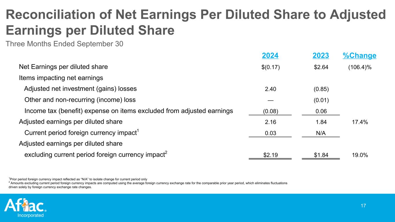Glossary of Non-U.S. GAAP Measures (cont’d) The Company defines these non-U.S. GAAP financial measures as follows: • Adjusted return on equity excluding foreign currency impact is adjusted earnings excluding the current period foreign currency impact divided by average shareholders’ equity, excluding AOCI. The Company considers adjusted return on equity excluding foreign currency impact important as it excludes changes in foreign currency and components of AOCI, which fluctuate due to market movements that are outside management's control. The most comparable U.S. GAAP financial measure for adjusted return on equity excluding foreign currency impact is return on average equity (ROE) as determined using net earnings and average total shareholders’ equity. • Adjusted book value including unrealized foreign currency translation gains and losses and pension liability adjustment is adjusted book value plus unrealized foreign currency translation gains and losses and pension liability adjustment. The Company considers adjusted book value including unrealized foreign currency translation gains and losses and pension liability adjustment important as it excludes certain components of AOCI, which fluctuates due to market movements that are outside management's control; however, it includes the impact of foreign currency as a result of the significance of Aflac’s Japan operation. The most comparable U.S. GAAP financial measure for adjusted book value including unrealized foreign currency translation gains and losses and pension liability adjustment is total book value. • Adjusted debt is the sum of notes payable, as recorded on the U.S. GAAP balance sheet, excluding 50% of subordinated debentures and perpetual bonds and all pre-funding of debt maturities. The Company considers adjusted debt important as it measures outstanding debt consistently with expectations of the Company’s rating agency stakeholders. The most comparable U.S. GAAP financial measure for adjusted debt is notes payable. • Adjusted debt including 50% of subordinated debentures and perpetual bonds is the sum of notes payable, as recorded on the U.S. GAAP balance sheet, excluding pre-funding of debt maturities. The Company considers adjusted debt including 50% of subordinated debentures and perpetual bonds important as it measures outstanding debt consistently with expectations of the Company’s rating agency stakeholders. The most comparable U.S. GAAP financial measure for adjusted debt including 50% of subordinated debentures and perpetual bonds is notes payable. • Adjusted book value is the U.S. GAAP book value (representing total shareholders’ equity), less AOCI as recorded on the U.S. GAAP balance sheet. Adjusted book value per common share is adjusted book value at the period end divided by the ending outstanding common shares for the period presented. The Company considers adjusted book value and adjusted book value per common share important as they exclude AOCI, which fluctuates due to market movements that are outside management’s control. The most comparable U.S. GAAP financial measures for adjusted book value and adjusted book value per common share are total book value and total book value per common share, respectively. 16