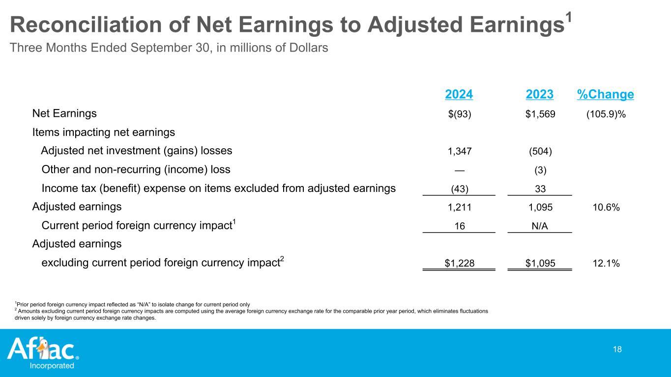 Reconciliation of Net Earnings Per Diluted Share to Adjusted Earnings per Diluted Share Three Months Ended September 30 2024 2023 %Change Net Earnings per diluted share $(0.17) $2.64 (106.4)% Items impacting net earnings Adjusted net investment (gains) losses 2.40 (0.85) Other and non-recurring (income) loss — (0.01) Income tax (benefit) expense on items excluded from adjusted earnings (0.08) 0.06 Adjusted earnings per diluted share 2.16 1.84 17.4% Current period foreign currency impact1 0.03 N/A Adjusted earnings per diluted share excluding current period foreign currency impact2 $2.19 $1.84 19.0% 1Prior period foreign currency impact reflected as “N/A” to isolate change for current period only 2 Amounts excluding current period foreign currency impacts are computed using the average foreign currency exchange rate for the comparable prior year period, which eliminates fluctuations driven solely by foreign currency exchange rate changes. 17
