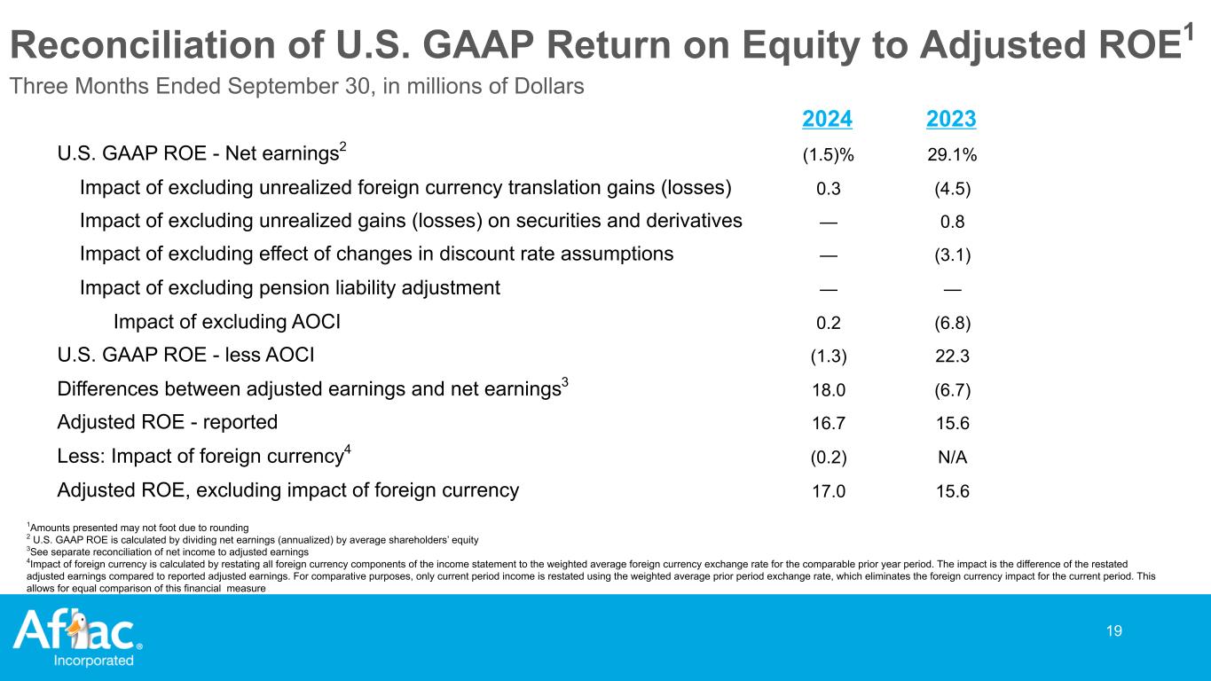 Reconciliation of U.S. GAAP Return on Equity to Adjusted ROE1 Three Months Ended September 30, in millions of Dollars 1Amounts presented may not foot due to rounding 2 U.S. GAAP ROE is calculated by dividing net earnings (annualized) by average shareholders’ equity 3See separate reconciliation of net income to adjusted earnings 4Impact of foreign currency is calculated by restating all foreign currency components of the income statement to the weighted average foreign currency exchange rate for the comparable prior year period. The impact is the difference of the restated adjusted earnings compared to reported adjusted earnings. For comparative purposes, only current period income is restated using the weighted average prior period exchange rate, which eliminates the foreign currency impact for the current period. This allows for equal comparison of this financial measure 2024 2023 U.S. GAAP ROE - Net earnings2 (1.5)% 29.1% Impact of excluding unrealized foreign currency translation gains (losses) 0.3 (4.5) Impact of excluding unrealized gains (losses) on securities and derivatives — 0.8 Impact of excluding effect of changes in discount rate assumptions — (3.1) Impact of excluding pension liability adjustment — — Impact of excluding AOCI 0.2 (6.8) U.S. GAAP ROE - less AOCI (1.3) 22.3 Differences between adjusted earnings and net earnings3 18.0 (6.7) Adjusted ROE - reported 16.7 15.6 Less: Impact of foreign currency4 (0.2) N/A Adjusted ROE, excluding impact of foreign currency 17.0 15.6 19