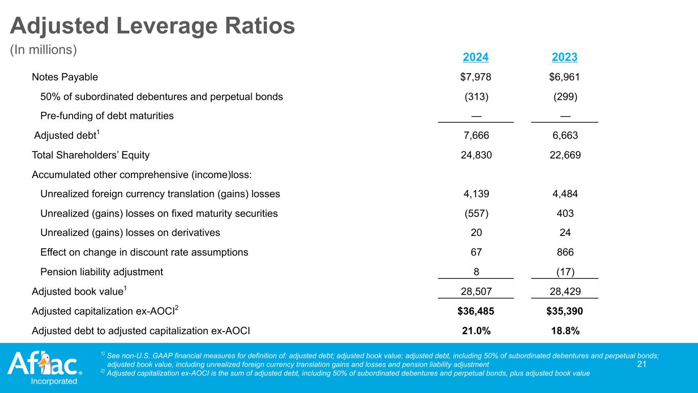 Adjusted Leverage Ratios (In millions) 2024 2023 Notes Payable $7,978 $6,961 50% of subordinated debentures and perpetual bonds (313) (299) Pre-funding of debt maturities — — Adjusted debt1 7,666 6,663 Total Shareholders’ Equity 24,830 22,669 Accumulated other comprehensive (income)loss: Unrealized foreign currency translation (gains) losses 4,139 4,484 Unrealized (gains) losses on fixed maturity securities (557) 403 Unrealized (gains) losses on derivatives 20 24 Effect on change in discount rate assumptions 67 866 Pension liability adjustment 8 (17) Adjusted book value1 28,507 28,429 Adjusted capitalization ex-AOCI2 $36,485 $35,390 Adjusted debt to adjusted capitalization ex-AOCI 21.0% 18.8% 1) See non-U.S. GAAP financial measures for definition of: adjusted debt; adjusted book value; adjusted debt, including 50% of subordinated debentures and perpetual bonds; adjusted book value, including unrealized foreign currency translation gains and losses and pension liability adjustment 2) Adjusted capitalization ex-AOCI is the sum of adjusted debt, including 50% of subordinated debentures and perpetual bonds, plus adjusted book value 21