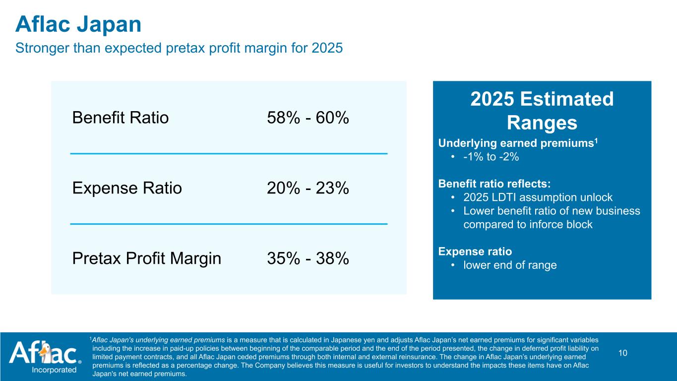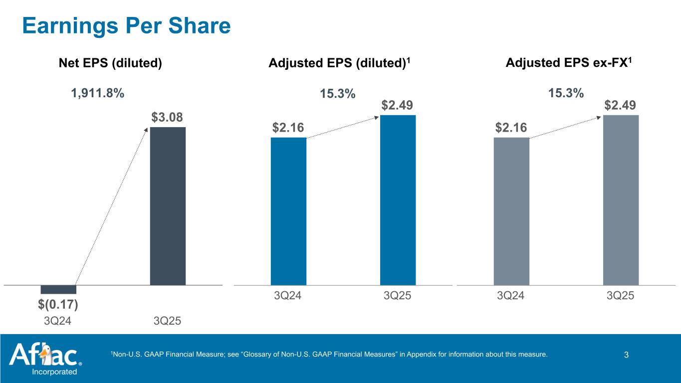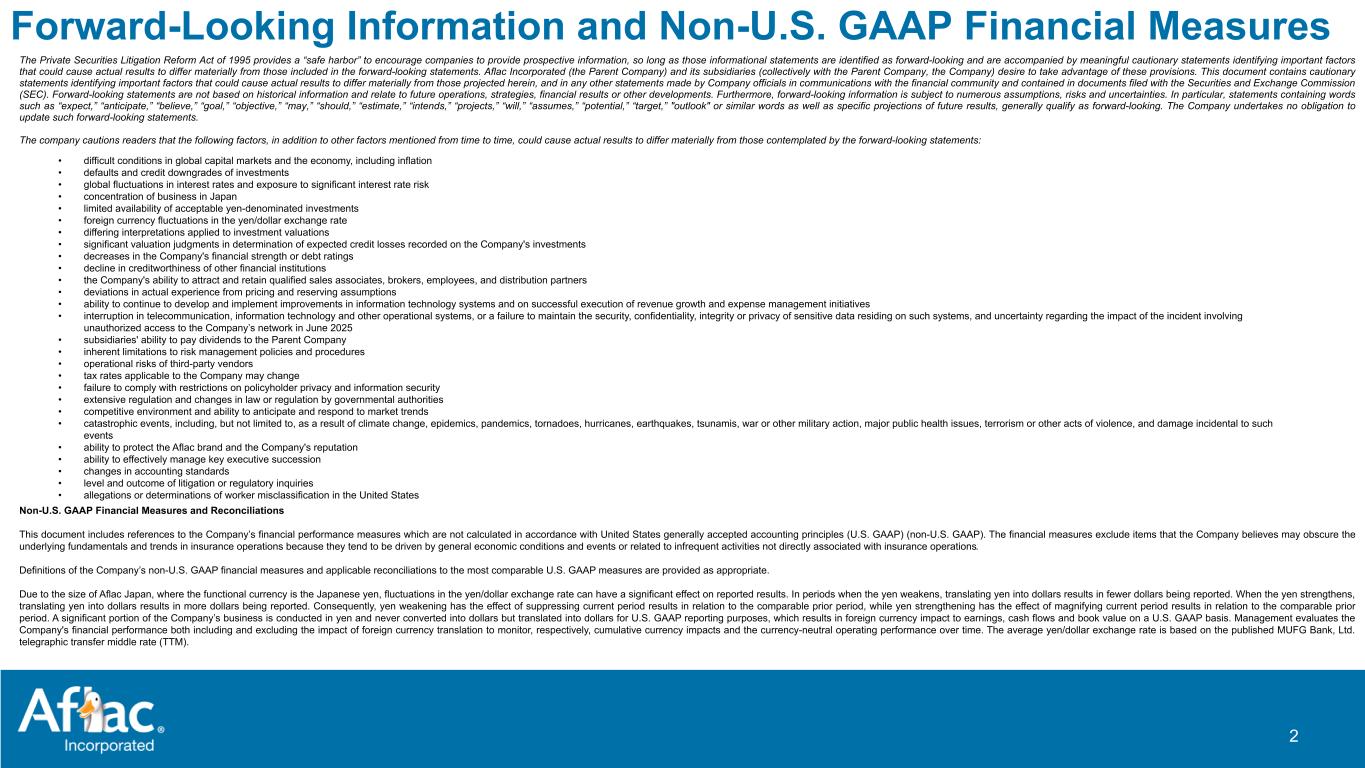 Forward-Looking Information and Non-U.S. GAAP Financial Measures The Private Securities Litigation Reform Act of 1995 provides a “safe harbor” to encourage companies to provide prospective information, so long as those informational statements are identified as forward-looking and are accompanied by meaningful cautionary statements identifying important factors that could cause actual results to differ materially from those included in the forward-looking statements. Aflac Incorporated (the Parent Company) and its subsidiaries (collectively with the Parent Company, the Company) desire to take advantage of these provisions. This document contains cautionary statements identifying important factors that could cause actual results to differ materially from those projected herein, and in any other statements made by Company officials in communications with the financial community and contained in documents filed with the Securities and Exchange Commission (SEC). Forward-looking statements are not based on historical information and relate to future operations, strategies, financial results or other developments. Furthermore, forward-looking information is subject to numerous assumptions, risks and uncertainties. In particular, statements containing words such as “expect,” “anticipate,” “believe,” “goal,” “objective,” “may,” “should,” “estimate,” “intends,” “projects,” “will,” “assumes,” “potential,” “target,” "outlook" or similar words as well as specific projections of future results, generally qualify as forward-looking. The Company undertakes no obligation to update such forward-looking statements. The company cautions readers that the following factors, in addition to other factors mentioned from time to time, could cause actual results to differ materially from those contemplated by the forward-looking statements: Non-U.S. GAAP Financial Measures and Reconciliations This document includes references to the Company’s financial performance measures which are not calculated in accordance with United States generally accepted accounting principles (U.S. GAAP) (non-U.S. GAAP). The financial measures exclude items that the Company believes may obscure the underlying fundamentals and trends in insurance operations because they tend to be driven by general economic conditions and events or related to infrequent activities not directly associated with insurance operations. Definitions of the Company’s non-U.S. GAAP financial measures and applicable reconciliations to the most comparable U.S. GAAP measures are provided as appropriate. Due to the size of Aflac Japan, where the functional currency is the Japanese yen, fluctuations in the yen/dollar exchange rate can have a significant effect on reported results. In periods when the yen weakens, translating yen into dollars results in fewer dollars being reported. When the yen strengthens, translating yen into dollars results in more dollars being reported. Consequently, yen weakening has the effect of suppressing current period results in relation to the comparable prior period, while yen strengthening has the effect of magnifying current period results in relation to the comparable prior period. A significant portion of the Company’s business is conducted in yen and never converted into dollars but translated into dollars for U.S. GAAP reporting purposes, which results in foreign currency impact to earnings, cash flows and book value on a U.S. GAAP basis. Management evaluates the Company's financial performance both including and excluding the impact of foreign currency translation to monitor, respectively, cumulative currency impacts and the currency-neutral operating performance over time. The average yen/dollar exchange rate is based on the published MUFG Bank, Ltd. telegraphic transfer middle rate (TTM). 2 • difficult conditions in global capital markets and the economy, including inflation • defaults and credit downgrades of investments • global fluctuations in interest rates and exposure to significant interest rate risk • concentration of business in Japan • limited availability of acceptable yen-denominated investments • foreign currency fluctuations in the yen/dollar exchange rate • differing interpretations applied to investment valuations • significant valuation judgments in determination of expected credit losses recorded on the Company's investments • decreases in the Company's financial strength or debt ratings • decline in creditworthiness of other financial institutions • the Company's ability to attract and retain qualified sales associates, brokers, employees, and distribution partners • deviations in actual experience from pricing and reserving assumptions • ability to continue to develop and implement improvements in information technology systems and on successful execution of revenue growth and expense management initiatives • interruption in telecommunication, information technology and other operational systems, or a failure to maintain the security, confidentiality, integrity or privacy of sensitive data residing on such systems, and uncertainty regarding the impact of the incident involving unauthorized access to the Company’s network in June 2025 • subsidiaries' ability to pay dividends to the Parent Company • inherent limitations to risk management policies and procedures • operational risks of third-party vendors • tax rates applicable to the Company may change • failure to comply with restrictions on policyholder privacy and information security • extensive regulation and changes in law or regulation by governmental authorities • competitive environment and ability to anticipate and respond to market trends • catastrophic events, including, but not limited to, as a result of climate change, epidemics, pandemics, tornadoes, hurricanes, earthquakes, tsunamis, war or other military action, major public health i