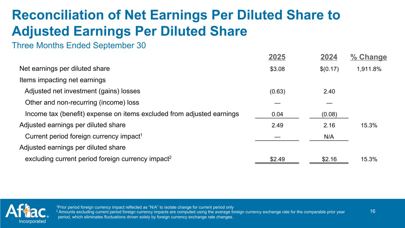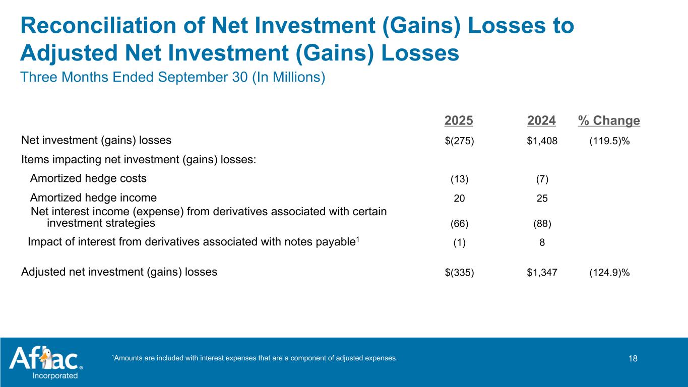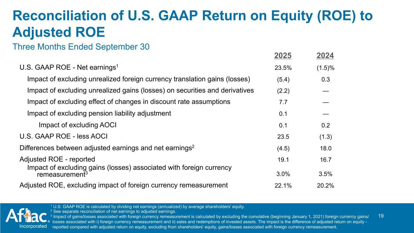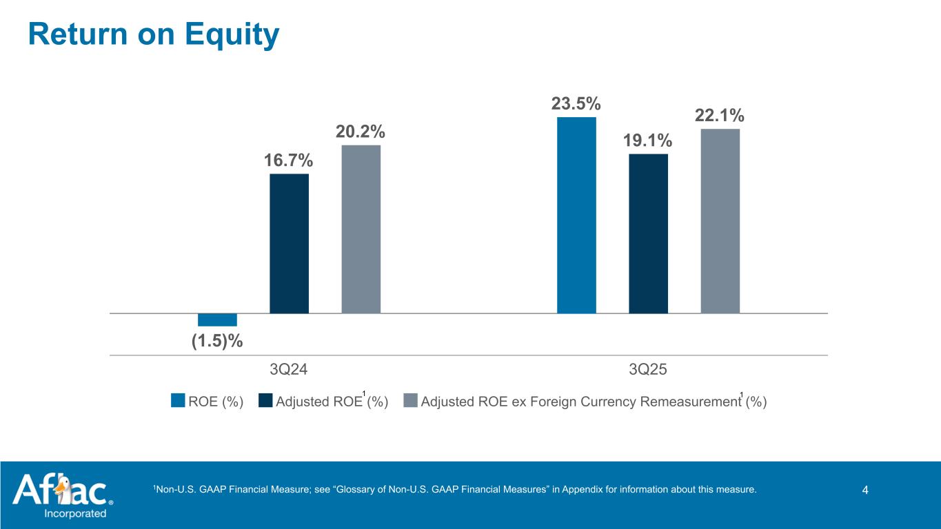 Forward-Looking Information and Non-U.S. GAAP Financial Measures The Private Securities Litigation Reform Act of 1995 provides a “safe harbor” to encourage companies to provide prospective information, so long as those informational statements are identified as forward-looking and are accompanied by meaningful cautionary statements identifying important factors that could cause actual results to differ materially from those included in the forward-looking statements. Aflac Incorporated (the Parent Company) and its subsidiaries (collectively with the Parent Company, the Company) desire to take advantage of these provisions. This document contains cautionary statements identifying important factors that could cause actual results to differ materially from those projected herein, and in any other statements made by Company officials in communications with the financial community and contained in documents filed with the Securities and Exchange Commission (SEC). Forward-looking statements are not based on historical information and relate to future operations, strategies, financial results or other developments. Furthermore, forward-looking information is subject to numerous assumptions, risks and uncertainties. In particular, statements containing words such as “expect,” “anticipate,” “believe,” “goal,” “objective,” “may,” “should,” “estimate,” “intends,” “projects,” “will,” “assumes,” “potential,” “target,” "outlook" or similar words as well as specific projections of future results, generally qualify as forward-looking. The Company undertakes no obligation to update such forward-looking statements. The company cautions readers that the following factors, in addition to other factors mentioned from time to time, could cause actual results to differ materially from those contemplated by the forward-looking statements: Non-U.S. GAAP Financial Measures and Reconciliations This document includes references to the Company’s financial performance measures which are not calculated in accordance with United States generally accepted accounting principles (U.S. GAAP) (non-U.S. GAAP). The financial measures exclude items that the Company believes may obscure the underlying fundamentals and trends in insurance operations because they tend to be driven by general economic conditions and events or related to infrequent activities not directly associated with insurance operations. Definitions of the Company’s non-U.S. GAAP financial measures and applicable reconciliations to the most comparable U.S. GAAP measures are provided as appropriate. Due to the size of Aflac Japan, where the functional currency is the Japanese yen, fluctuations in the yen/dollar exchange rate can have a significant effect on reported results. In periods when the yen weakens, translating yen into dollars results in fewer dollars being reported. When the yen strengthens, translating yen into dollars results in more dollars being reported. Consequently, yen weakening has the effect of suppressing current period results in relation to the comparable prior period, while yen strengthening has the effect of magnifying current period results in relation to the comparable prior period. A significant portion of the Company’s business is conducted in yen and never converted into dollars but translated into dollars for U.S. GAAP reporting purposes, which results in foreign currency impact to earnings, cash flows and book value on a U.S. GAAP basis. Management evaluates the Company's financial performance both including and excluding the impact of foreign currency translation to monitor, respectively, cumulative currency impacts and the currency-neutral operating performance over time. The average yen/dollar exchange rate is based on the published MUFG Bank, Ltd. telegraphic transfer middle rate (TTM). 2 • difficult conditions in global capital markets and the economy, including inflation • defaults and credit downgrades of investments • global fluctuations in interest rates and exposure to significant interest rate risk • concentration of business in Japan • limited availability of acceptable yen-denominated investments • foreign currency fluctuations in the yen/dollar exchange rate • differing interpretations applied to investment valuations • significant valuation judgments in determination of expected credit losses recorded on the Company's investments • decreases in the Company's financial strength or debt ratings • decline in creditworthiness of other financial institutions • the Company's ability to attract and retain qualified sales associates, brokers, employees, and distribution partners • deviations in actual experience from pricing and reserving assumptions • ability to continue to develop and implement improvements in information technology systems and on successful execution of revenue growth and expense management initiatives • interruption in telecommunication, information technology and other operational systems, or a failure to maintain the security, confidentiality, integrity or privacy of sensitive data residing on such systems, and uncertainty regarding the impact of the incident involving unauthorized access to the Company’s network in June 2025 • subsidiaries' ability to pay dividends to the Parent Company • inherent limitations to risk management policies and procedures • operational risks of third-party vendors • tax rates applicable to the Company may change • failure to comply with restrictions on policyholder privacy and information security • extensive regulation and changes in law or regulation by governmental authorities • competitive environment and ability to anticipate and respond to market trends • catastrophic events, including, but not limited to, as a result of climate change, epidemics, pandemics, tornadoes, hurricanes, earthquakes, tsunamis, war or other military action, major public health i