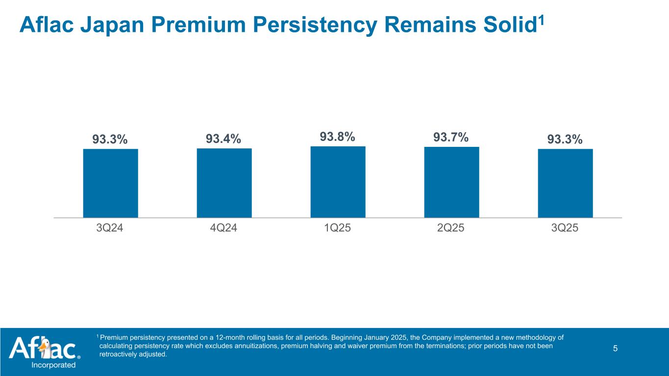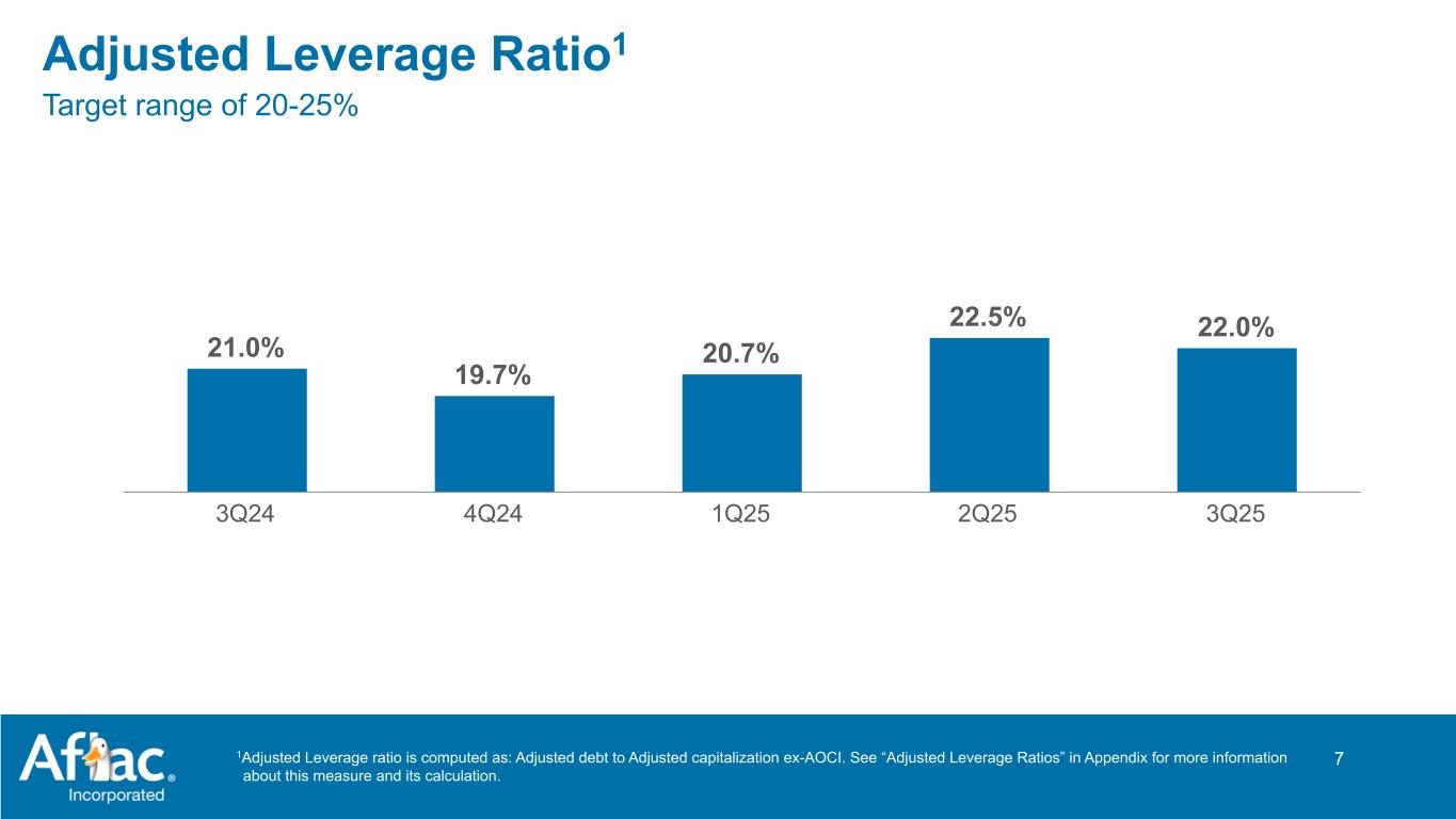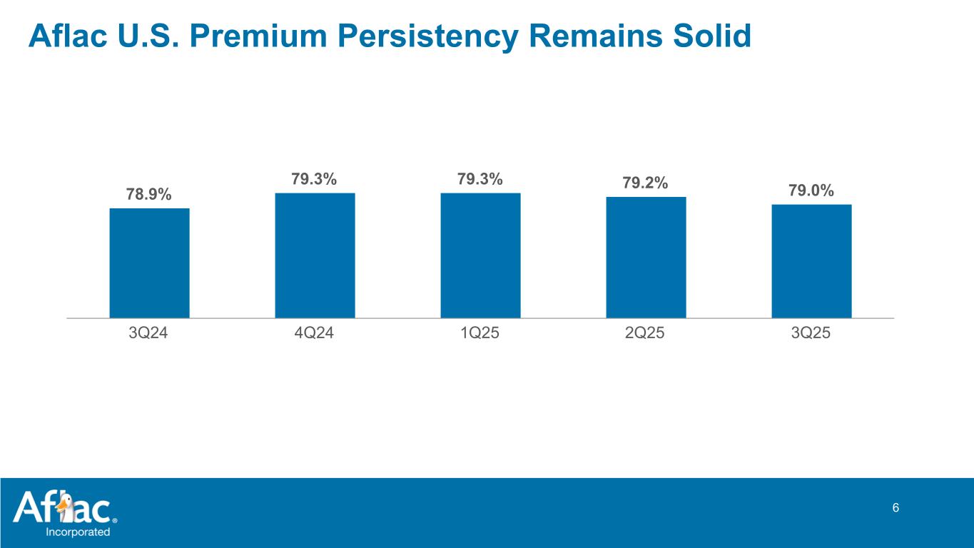 Aflac U.S. Premium Persistency Remains Solid 78.9% 79.3% 79.3% 79.2% 79.0% 3Q24 4Q24 1Q25 2Q25 3Q25 6