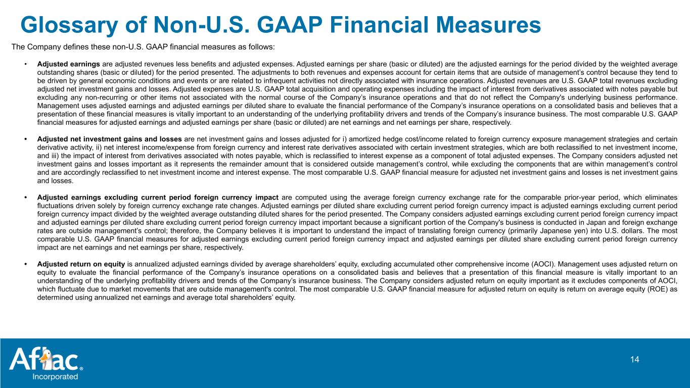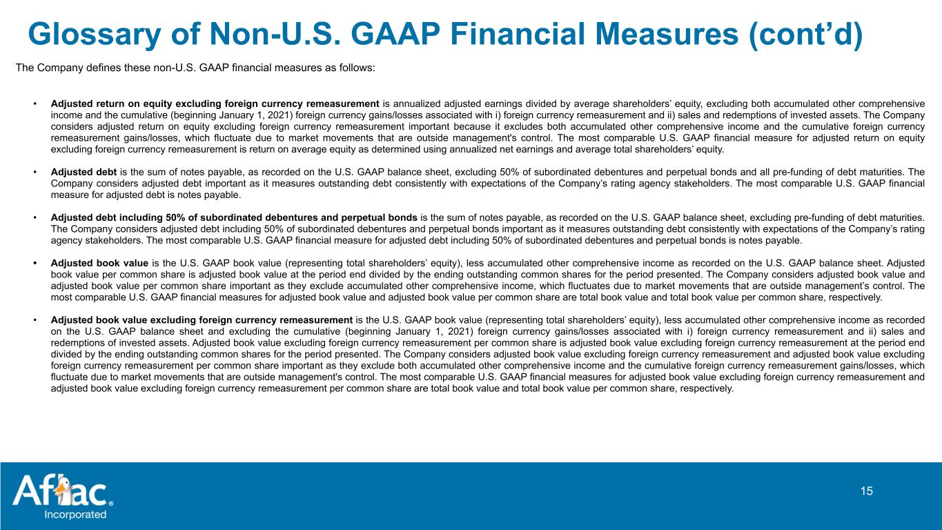 Glossary of Non-U.S. GAAP Financial Measures The Company defines these non-U.S. GAAP financial measures as follows: • Adjusted earnings are adjusted revenues less benefits and adjusted expenses. Adjusted earnings per share (basic or diluted) are the adjusted earnings for the period divided by the weighted average outstanding shares (basic or diluted) for the period presented. The adjustments to both revenues and expenses account for certain items that are outside of management’s control because they tend to be driven by general economic conditions and events or are related to infrequent activities not directly associated with insurance operations. Adjusted revenues are U.S. GAAP total revenues excluding adjusted net investment gains and losses. Adjusted expenses are U.S. GAAP total acquisition and operating expenses including the impact of interest from derivatives associated with notes payable but excluding any non-recurring or other items not associated with the normal course of the Company’s insurance operations and that do not reflect the Company's underlying business performance. Management uses adjusted earnings and adjusted earnings per diluted share to evaluate the financial performance of the Company’s insurance operations on a consolidated basis and believes that a presentation of these financial measures is vitally important to an understanding of the underlying profitability drivers and trends of the Company’s insurance business. The most comparable U.S. GAAP financial measures for adjusted earnings and adjusted earnings per share (basic or diluted) are net earnings and net earnings per share, respectively. • Adjusted net investment gains and losses are net investment gains and losses adjusted for i) amortized hedge cost/income related to foreign currency exposure management strategies and certain derivative activity, ii) net interest income/expense from foreign currency and interest rate derivatives associated with certain investment strategies, which are both reclassified to net investment income, and iii) the impact of interest from derivatives associated with notes payable, which is reclassified to interest expense as a component of total adjusted expenses. The Company considers adjusted net investment gains and losses important as it represents the remainder amount that is considered outside management’s control, while excluding the components that are within management’s control and are accordingly reclassified to net investment income and interest expense. The most comparable U.S. GAAP financial measure for adjusted net investment gains and losses is net investment gains and losses. • Adjusted earnings excluding current period foreign currency impact are computed using the average foreign currency exchange rate for the comparable prior-year period, which eliminates fluctuations driven solely by foreign currency exchange rate changes. Adjusted earnings per diluted share excluding current period foreign currency impact is adjusted earnings excluding current period foreign currency impact divided by the weighted average outstanding diluted shares for the period presented. The Company considers adjusted earnings excluding current period foreign currency impact and adjusted earnings per diluted share excluding current period foreign currency impact important because a significant portion of the Company's business is conducted in Japan and foreign exchange rates are outside management’s control; therefore, the Company believes it is important to understand the impact of translating foreign currency (primarily Japanese yen) into U.S. dollars. The most comparable U.S. GAAP financial measures for adjusted earnings excluding current period foreign currency impact and adjusted earnings per diluted share excluding current period foreign currency impact are net earnings and net earnings per share, respectively. • Adjusted return on equity is annualized adjusted earnings divided by average shareholders’ equity, excluding accumulated other comprehensive income (AOCI). Management uses adjusted return on equity to evaluate the financial performance of the Company’s insurance operations on a consolidated basis and believes that a presentation of this financial measure is vitally important to an understanding of the underlying profitability drivers and trends of the Company’s insurance business. The Company considers adjusted return on equity important as it excludes components of AOCI, which fluctuate due to market movements that are outside management's control. The most comparable U.S. GAAP financial measure for adjusted return on equity is return on average equity (ROE) as determined using annualized net earnings and average total shareholders’ equity. 14