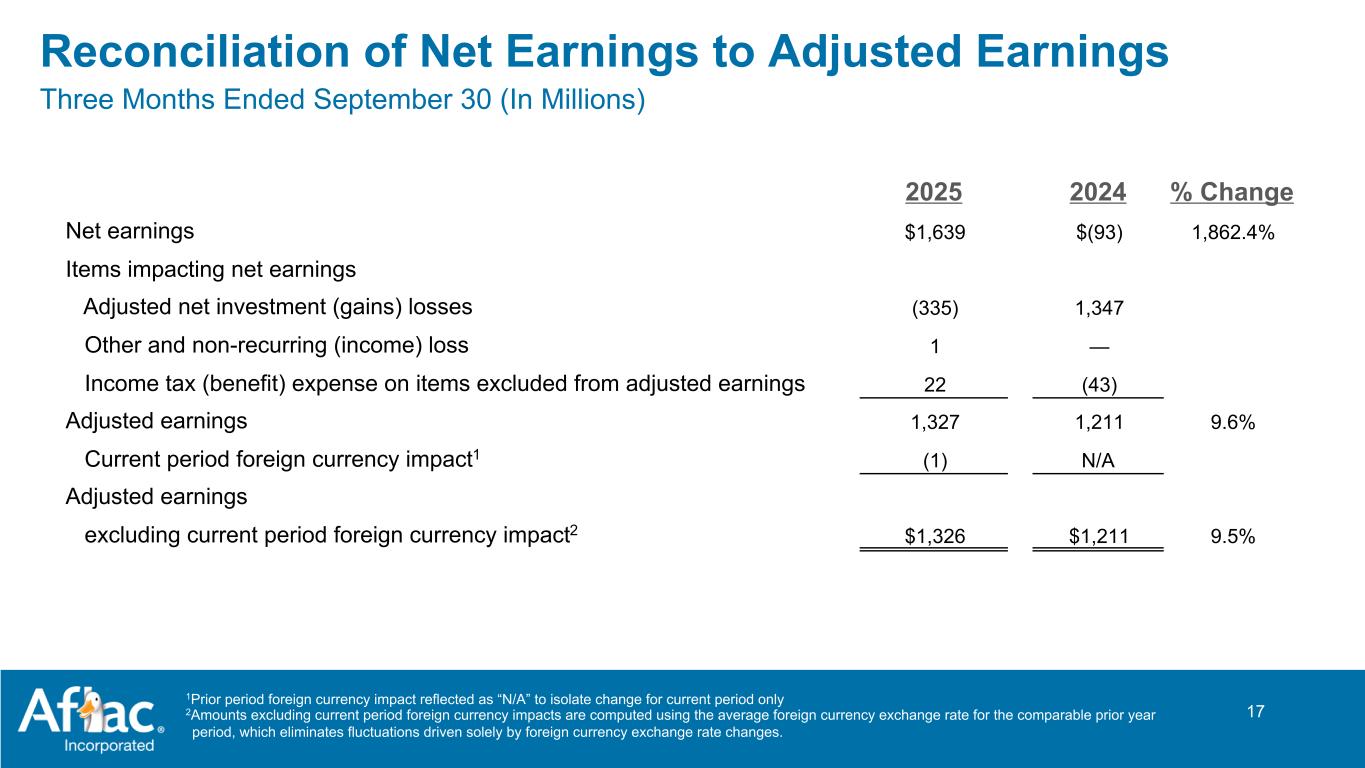 Reconciliation of Net Earnings Per Diluted Share to Adjusted Earnings Per Diluted Share Three Months Ended September 30 2025 2024 % Change Net earnings per diluted share $3.08 $(0.17) 1,911.8% Items impacting net earnings Adjusted net investment (gains) losses (0.63) 2.40 Other and non-recurring (income) loss — — Income tax (benefit) expense on items excluded from adjusted earnings 0.04 (0.08) Adjusted earnings per diluted share 2.49 2.16 15.3% Current period foreign currency impact1 — N/A Adjusted earnings per diluted share excluding current period foreign currency impact2 $2.49 $2.16 15.3% 1Prior period foreign currency impact reflected as “N/A” to isolate change for current period only 2 Amounts excluding current period foreign currency impacts are computed using the average foreign currency exchange rate for the comparable prior year period, which eliminates fluctuations driven solely by foreign currency exchange rate changes. 16
