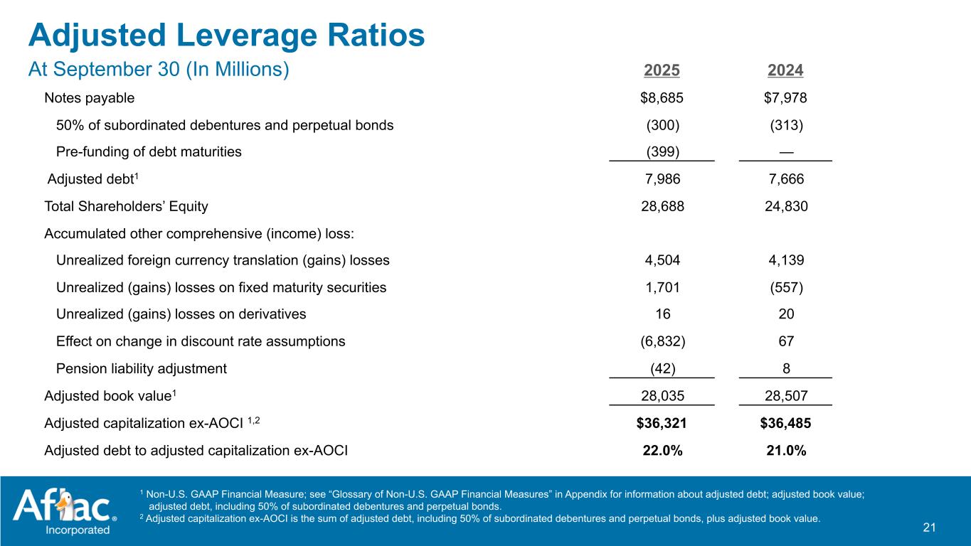 Adjusted Leverage Ratios At September 30 (In Millions) 2025 2024 Notes payable $8,685 $7,978 50% of subordinated debentures and perpetual bonds (300) (313) Pre-funding of debt maturities (399) — Adjusted debt1 7,986 7,666 Total Shareholders’ Equity 28,688 24,830 Accumulated other comprehensive (income) loss: Unrealized foreign currency translation (gains) losses 4,504 4,139 Unrealized (gains) losses on fixed maturity securities 1,701 (557) Unrealized (gains) losses on derivatives 16 20 Effect on change in discount rate assumptions (6,832) 67 Pension liability adjustment (42) 8 Adjusted book value1 28,035 28,507 Adjusted capitalization ex-AOCI 1,2 $36,321 $36,485 Adjusted debt to adjusted capitalization ex-AOCI 22.0% 21.0% 1 Non-U.S. GAAP Financial Measure; see “Glossary of Non-U.S. GAAP Financial Measures” in Appendix for information about adjusted debt; adjusted book value; adjusted debt, including 50% of subordinated debentures and perpetual bonds. 2 Adjusted capitalization ex-AOCI is the sum of adjusted debt, including 50% of subordinated debentures and perpetual bonds, plus adjusted book value. 21