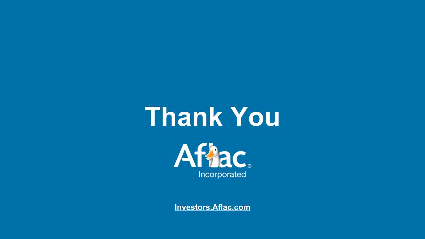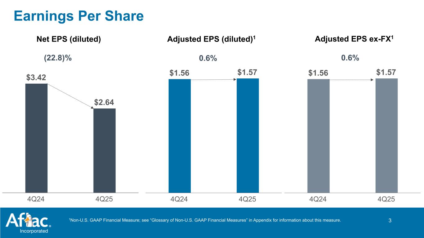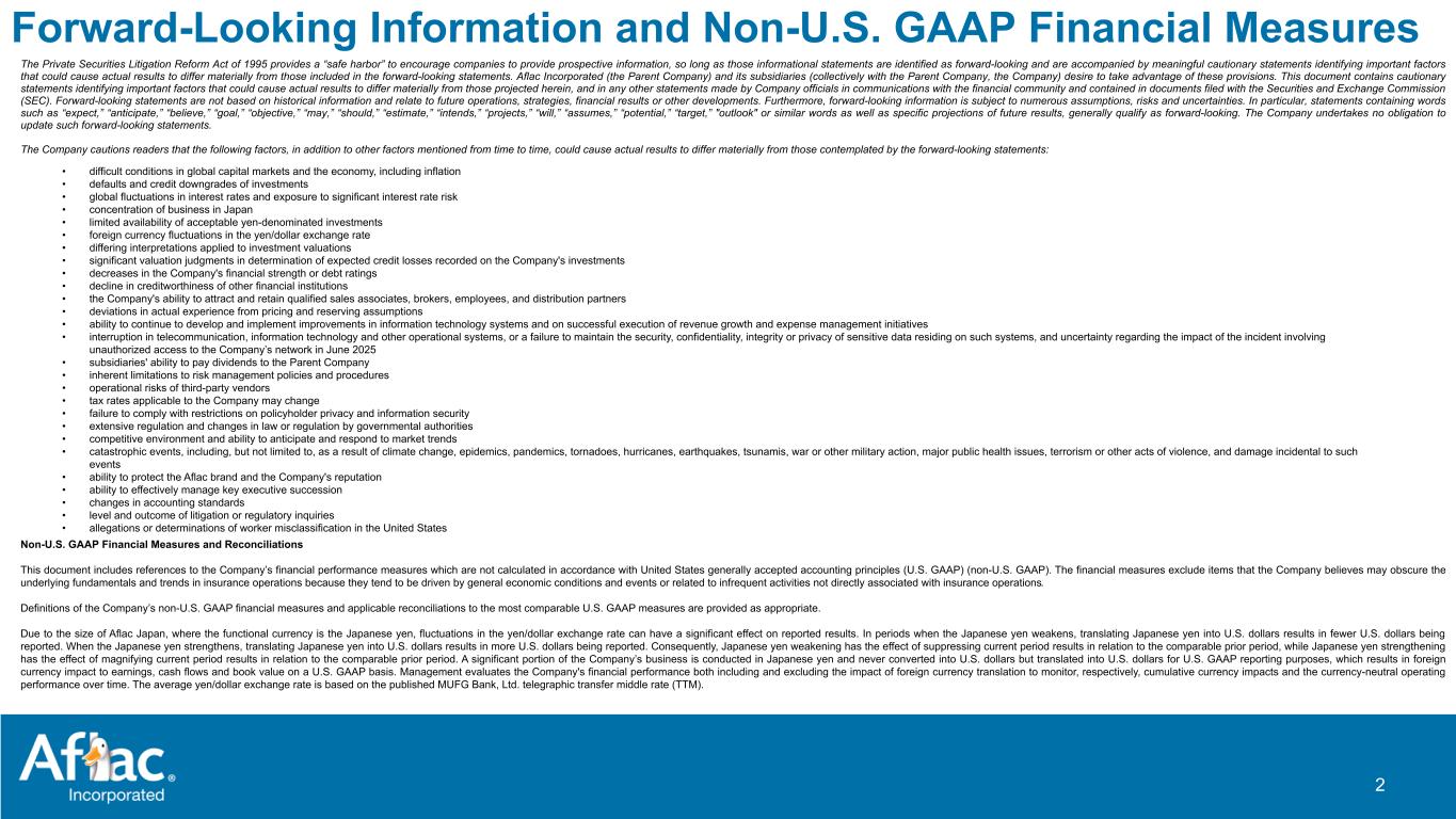 Forward-Looking Information and Non-U.S. GAAP Financial Measures The Private Securities Litigation Reform Act of 1995 provides a “safe harbor” to encourage companies to provide prospective information, so long as those informational statements are identified as forward-looking and are accompanied by meaningful cautionary statements identifying important factors that could cause actual results to differ materially from those included in the forward-looking statements. Aflac Incorporated (the Parent Company) and its subsidiaries (collectively with the Parent Company, the Company) desire to take advantage of these provisions. This document contains cautionary statements identifying important factors that could cause actual results to differ materially from those projected herein, and in any other statements made by Company officials in communications with the financial community and contained in documents filed with the Securities and Exchange Commission (SEC). Forward-looking statements are not based on historical information and relate to future operations, strategies, financial results or other developments. Furthermore, forward-looking information is subject to numerous assumptions, risks and uncertainties. In particular, statements containing words such as “expect,” “anticipate,” “believe,” “goal,” “objective,” “may,” “should,” “estimate,” “intends,” “projects,” “will,” “assumes,” “potential,” “target,” "outlook" or similar words as well as specific projections of future results, generally qualify as forward-looking. The Company undertakes no obligation to update such forward-looking statements. The Company cautions readers that the following factors, in addition to other factors mentioned from time to time, could cause actual results to differ materially from those contemplated by the forward-looking statements: Non-U.S. GAAP Financial Measures and Reconciliations This document includes references to the Company’s financial performance measures which are not calculated in accordance with United States generally accepted accounting principles (U.S. GAAP) (non-U.S. GAAP). The financial measures exclude items that the Company believes may obscure the underlying fundamentals and trends in insurance operations because they tend to be driven by general economic conditions and events or related to infrequent activities not directly associated with insurance operations. Definitions of the Company’s non-U.S. GAAP financial measures and applicable reconciliations to the most comparable U.S. GAAP measures are provided as appropriate. Due to the size of Aflac Japan, where the functional currency is the Japanese yen, fluctuations in the yen/dollar exchange rate can have a significant effect on reported results. In periods when the Japanese yen weakens, translating Japanese yen into U.S. dollars results in fewer U.S. dollars being reported. When the Japanese yen strengthens, translating Japanese yen into U.S. dollars results in more U.S. dollars being reported. Consequently, Japanese yen weakening has the effect of suppressing current period results in relation to the comparable prior period, while Japanese yen strengthening has the effect of magnifying current period results in relation to the comparable prior period. A significant portion of the Company’s business is conducted in Japanese yen and never converted into U.S. dollars but translated into U.S. dollars for U.S. GAAP reporting purposes, which results in foreign currency impact to earnings, cash flows and book value on a U.S. GAAP basis. Management evaluates the Company's financial performance both including and excluding the impact of foreign currency translation to monitor, respectively, cumulative currency impacts and the currency-neutral operating performance over time. The average yen/dollar exchange rate is based on the published MUFG Bank, Ltd. telegraphic transfer middle rate (TTM). 2 • difficult conditions in global capital markets and the economy, including inflation • defaults and credit downgrades of investments • global fluctuations in interest rates and exposure to significant interest rate risk • concentration of business in Japan • limited availability of acceptable yen-denominated investments • foreign currency fluctuations in the yen/dollar exchange rate • differing interpretations applied to investment valuations • significant valuation judgments in determination of expected credit losses recorded on the Company's investments • decreases in the Company's financial strength or debt ratings • decline in creditworthiness of other financial institutions • the Company's ability to attract and retain qualified sales associates, brokers, employees, and distribution partners • deviations in actual experience from pricing and reserving assumptions • ability to continue to develop and implement improvements in information technology systems and on successful execution of revenue growth and expense management initiatives • interruption in telecommunication, information technology and other operational systems, or a failure to maintain the security, confidentiality, integrity or privacy of sensitive data residing on such systems, and uncertainty regarding the impact of the incident involving unauthorized access to the Company’s network in June 2025 • subsidiaries' ability to pay dividends to the Parent Company • inherent limitations to risk management policies and procedures • operational risks of third-party vendors • tax rates applicable to the Company may change • failure to comply with restrictions on policyholder privacy and information security • extensive regulation and changes in law or regulation by governmental authorities • competitive environment and ability to anticipate and respond to market trends • catastrophic events, including, but not limited to, as a result of climate change, epidemics, pandemics, torn