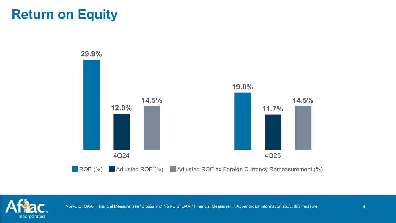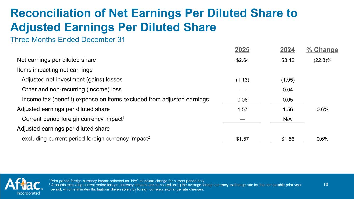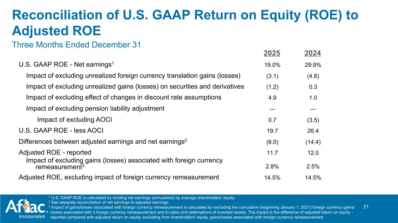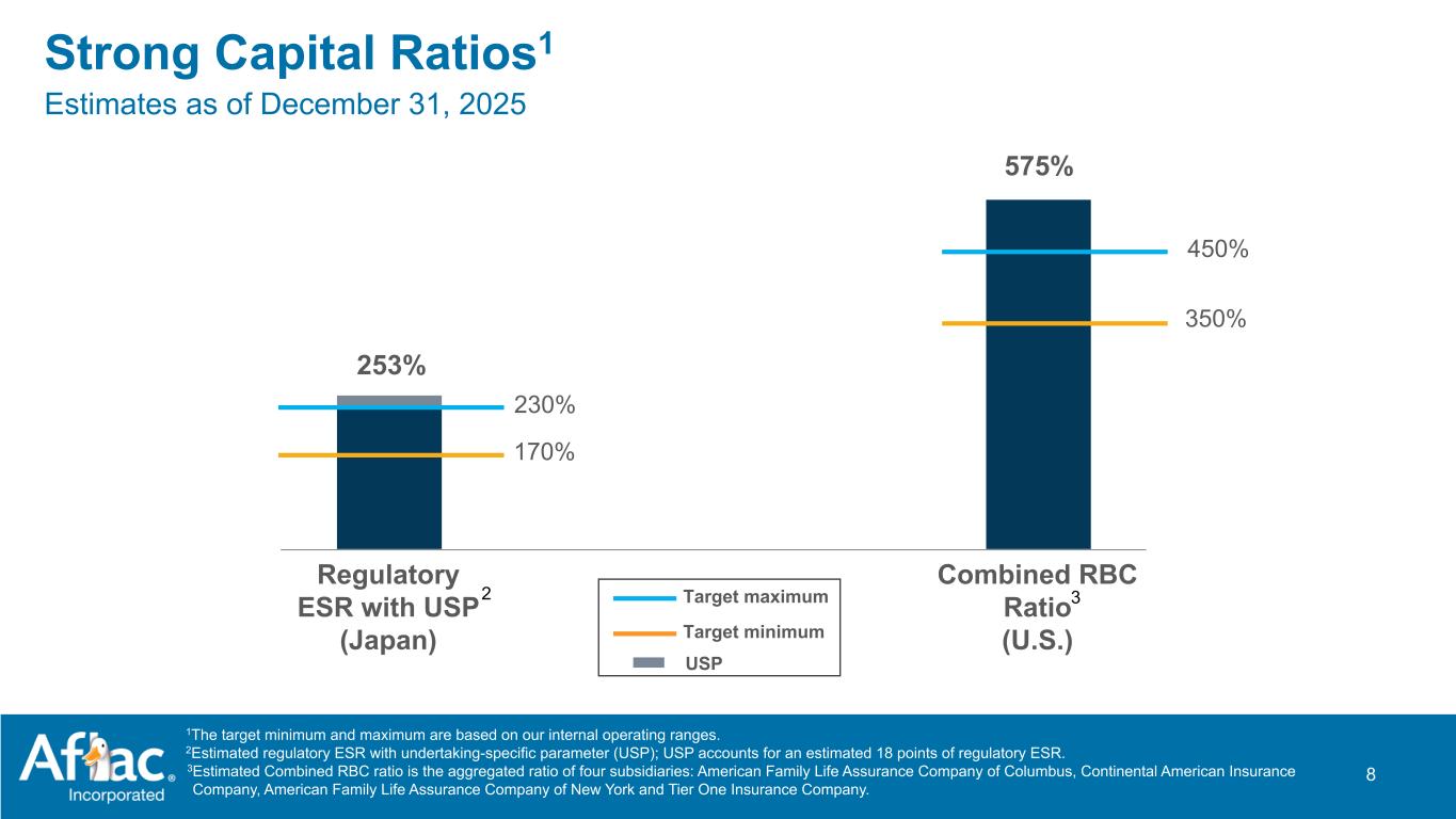Forward-Looking Information and Non-U.S. GAAP Financial Measures The Private Securities Litigation Reform Act of 1995 provides a “safe harbor” to encourage companies to provide prospective information, so long as those informational statements are identified as forward-looking and are accompanied by meaningful cautionary statements identifying important factors that could cause actual results to differ materially from those included in the forward-looking statements. Aflac Incorporated (the Parent Company) and its subsidiaries (collectively with the Parent Company, the Company) desire to take advantage of these provisions. This document contains cautionary statements identifying important factors that could cause actual results to differ materially from those projected herein, and in any other statements made by Company officials in communications with the financial community and contained in documents filed with the Securities and Exchange Commission (SEC). Forward-looking statements are not based on historical information and relate to future operations, strategies, financial results or other developments. Furthermore, forward-looking information is subject to numerous assumptions, risks and uncertainties. In particular, statements containing words such as “expect,” “anticipate,” “believe,” “goal,” “objective,” “may,” “should,” “estimate,” “intends,” “projects,” “will,” “assumes,” “potential,” “target,” "outlook" or similar words as well as specific projections of future results, generally qualify as forward-looking. The Company undertakes no obligation to update such forward-looking statements. The Company cautions readers that the following factors, in addition to other factors mentioned from time to time, could cause actual results to differ materially from those contemplated by the forward-looking statements: Non-U.S. GAAP Financial Measures and Reconciliations This document includes references to the Company’s financial performance measures which are not calculated in accordance with United States generally accepted accounting principles (U.S. GAAP) (non-U.S. GAAP). The financial measures exclude items that the Company believes may obscure the underlying fundamentals and trends in insurance operations because they tend to be driven by general economic conditions and events or related to infrequent activities not directly associated with insurance operations. Definitions of the Company’s non-U.S. GAAP financial measures and applicable reconciliations to the most comparable U.S. GAAP measures are provided as appropriate. Due to the size of Aflac Japan, where the functional currency is the Japanese yen, fluctuations in the yen/dollar exchange rate can have a significant effect on reported results. In periods when the Japanese yen weakens, translating Japanese yen into U.S. dollars results in fewer U.S. dollars being reported. When the Japanese yen strengthens, translating Japanese yen into U.S. dollars results in more U.S. dollars being reported. Consequently, Japanese yen weakening has the effect of suppressing current period results in relation to the comparable prior period, while Japanese yen strengthening has the effect of magnifying current period results in relation to the comparable prior period. A significant portion of the Company’s business is conducted in Japanese yen and never converted into U.S. dollars but translated into U.S. dollars for U.S. GAAP reporting purposes, which results in foreign currency impact to earnings, cash flows and book value on a U.S. GAAP basis. Management evaluates the Company's financial performance both including and excluding the impact of foreign currency translation to monitor, respectively, cumulative currency impacts and the currency-neutral operating performance over time. The average yen/dollar exchange rate is based on the published MUFG Bank, Ltd. telegraphic transfer middle rate (TTM). 2 • difficult conditions in global capital markets and the economy, including inflation • defaults and credit downgrades of investments • global fluctuations in interest rates and exposure to significant interest rate risk • concentration of business in Japan • limited availability of acceptable yen-denominated investments • foreign currency fluctuations in the yen/dollar exchange rate • differing interpretations applied to investment valuations • significant valuation judgments in determination of expected credit losses recorded on the Company's investments • decreases in the Company's financial strength or debt ratings • decline in creditworthiness of other financial institutions • the Company's ability to attract and retain qualified sales associates, brokers, employees, and distribution partners • deviations in actual experience from pricing and reserving assumptions • ability to continue to develop and implement improvements in information technology systems and on successful execution of revenue growth and expense management initiatives • interruption in telecommunication, information technology and other operational systems, or a failure to maintain the security, confidentiality, integrity or privacy of sensitive data residing on such systems, and uncertainty regarding the impact of the incident involving unauthorized access to the Company’s network in June 2025 • subsidiaries' ability to pay dividends to the Parent Company • inherent limitations to risk management policies and procedures • operational risks of third-party vendors • tax rates applicable to the Company may change • failure to comply with restrictions on policyholder privacy and information security • extensive regulation and changes in law or regulation by governmental authorities • competitive environment and ability to anticipate and respond to market trends • catastrophic events, including, but not limited to, as a result of climate change, epidemics, pandemics, torn