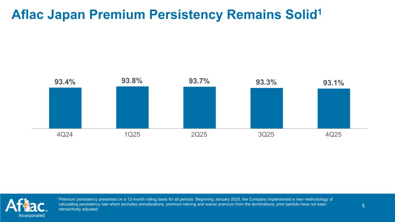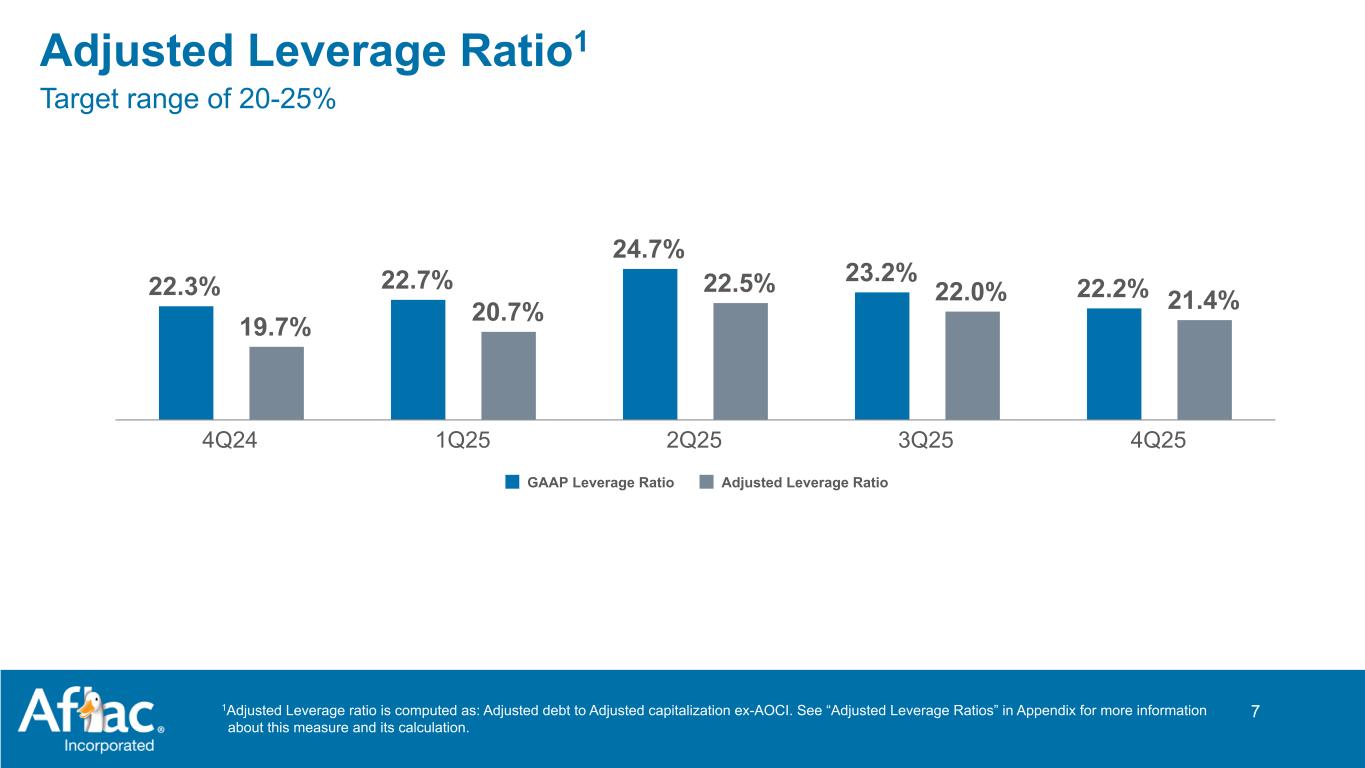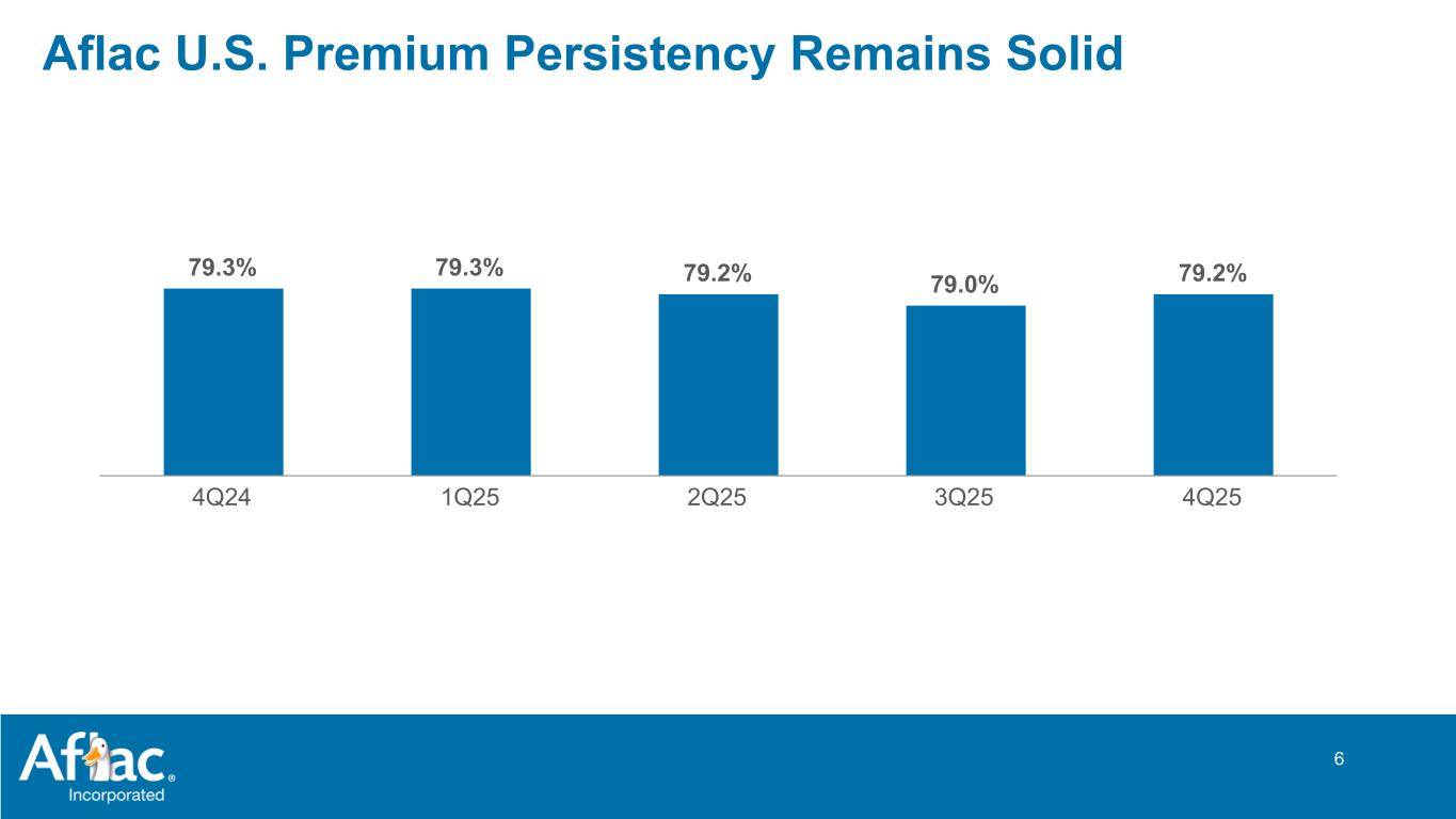 Aflac U.S. Premium Persistency Remains Solid 79.3% 79.3% 79.2% 79.0% 79.2% 4Q24 1Q25 2Q25 3Q25 4Q25 6
