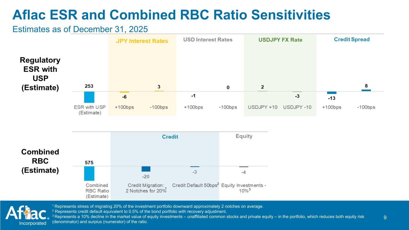 Regulatory ESR with USP (Japan) Combined RBC Ratio (U.S.) Strong Capital Ratios1 Estimates as of December 31, 2025 230% 253% 170% 1The target minimum and maximum are based on our internal operating ranges. 2Estimated regulatory ESR with undertaking-specific parameter (USP); USP accounts for an estimated 18 points of regulatory ESR. 3Estimated Combined RBC ratio is the aggregated ratio of four subsidiaries: American Family Life Assurance Company of Columbus, Continental American Insurance Company, American Family Life Assurance Company of New York and Tier One Insurance Company. 575% 8 Target maximum Target minimum 450% 350% 2 3 USP