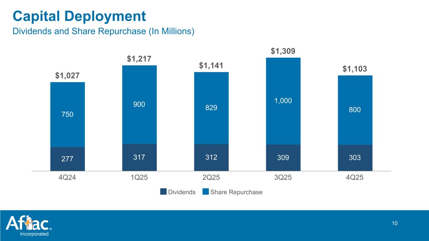 Aflac ESR and Combined RBC Ratio Sensitivities Estimates as of December 31, 2025 1 Represents stress of migrating 20% of the investment portfolio downward approximately 2 notches on average. 2 Represents credit default equivalent to 0.5% of the bond portfolio with recovery adjustment. 3 Represents a 10% decline in the market value of equity investments – unaffiliated common stocks and private equity – in the portfolio, which reduces both equity risk (denominator) and surplus (numerator) of the ratio. 9
