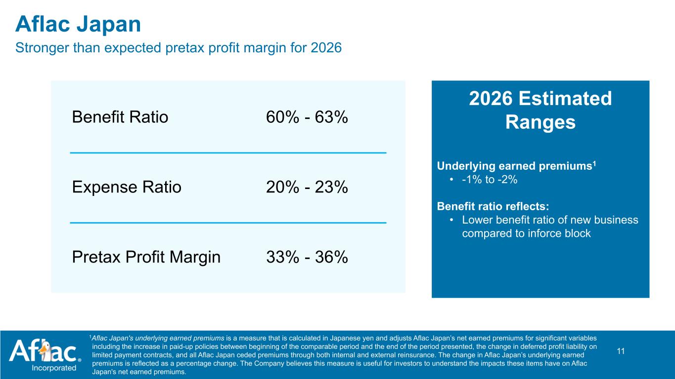 11 2026 Estimated Ranges Underlying earned premiums1 • -1% to -2% Benefit ratio reflects: • Lower benefit ratio of new business compared to inforce block Benefit Ratio 60% - 63% Expense Ratio 20% - 23% Pretax Profit Margin 33% - 36% 1Aflac Japan's underlying earned premiums is a measure that is calculated in Japanese yen and adjusts Aflac Japan’s net earned premiums for significant variables including the increase in paid-up policies between beginning of the comparable period and the end of the period presented, the change in deferred profit liability on limited payment contracts, and all Aflac Japan ceded premiums through both internal and external reinsurance. The change in Aflac Japan’s underlying earned premiums is reflected as a percentage change. The Company believes this measure is useful for investors to understand the impacts these items have on Aflac Japan's net earned premiums. Aflac Japan Stronger than expected pretax profit margin for 2026