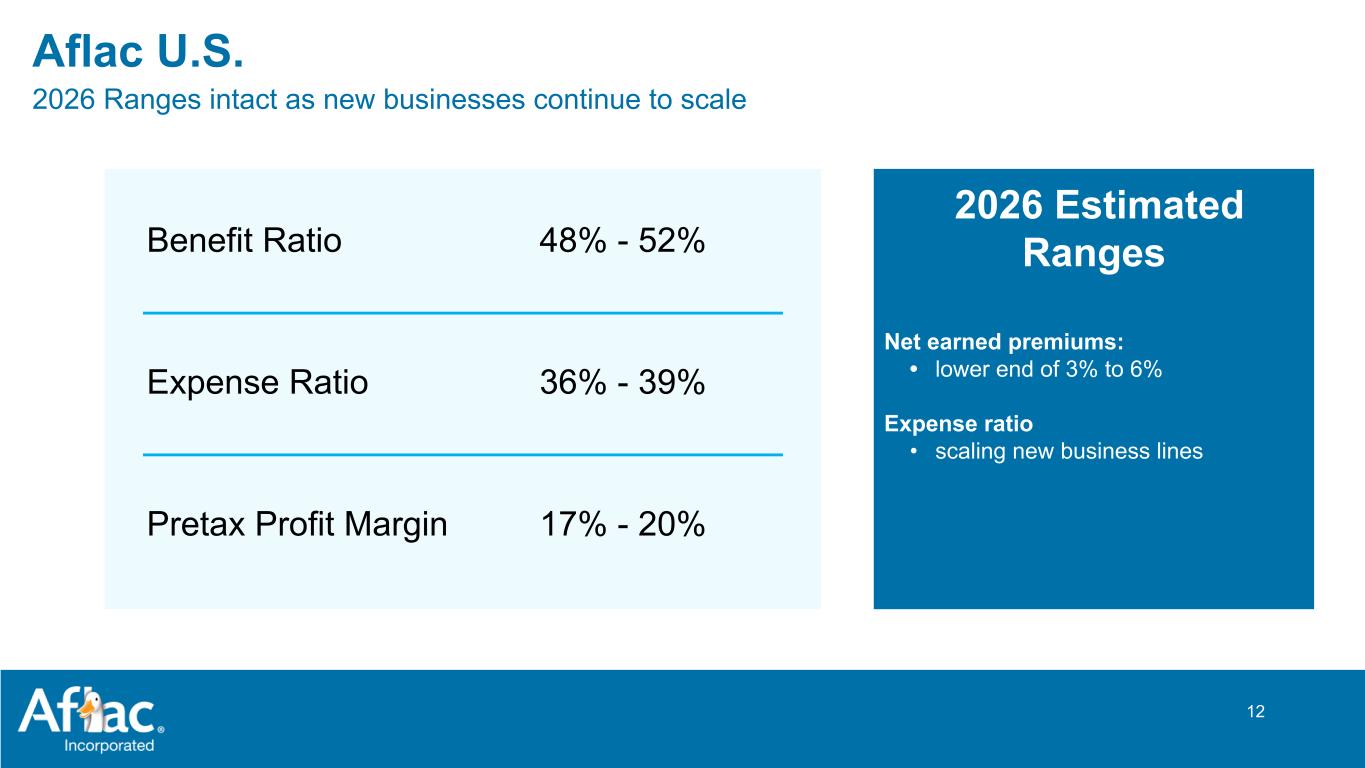 12 2026 Estimated Ranges Net earned premiums: • lower end of 3% to 6% Expense ratio • scaling new business lines Benefit Ratio 48% - 52% Expense Ratio 36% - 39% Pretax Profit Margin 17% - 20% Aflac U.S. 2026 Ranges intact as new businesses continue to scale