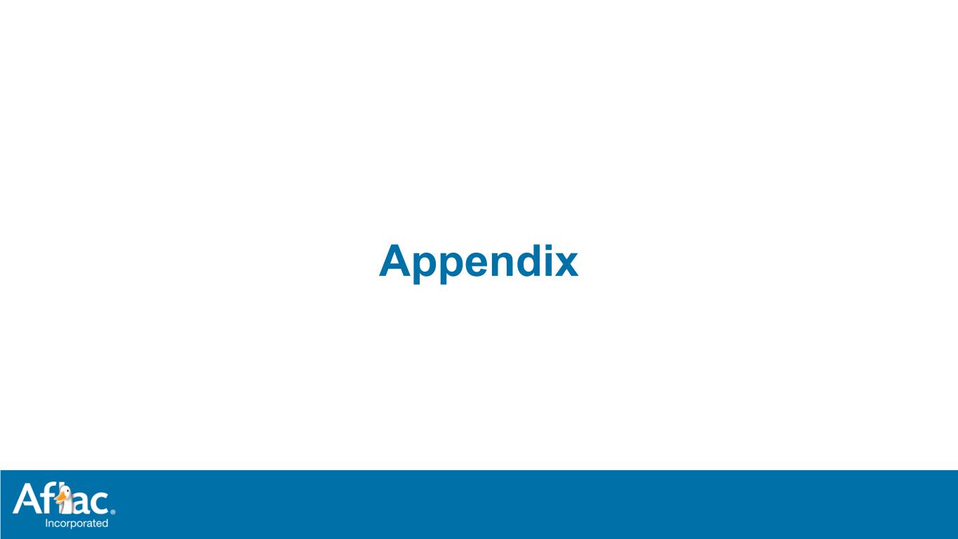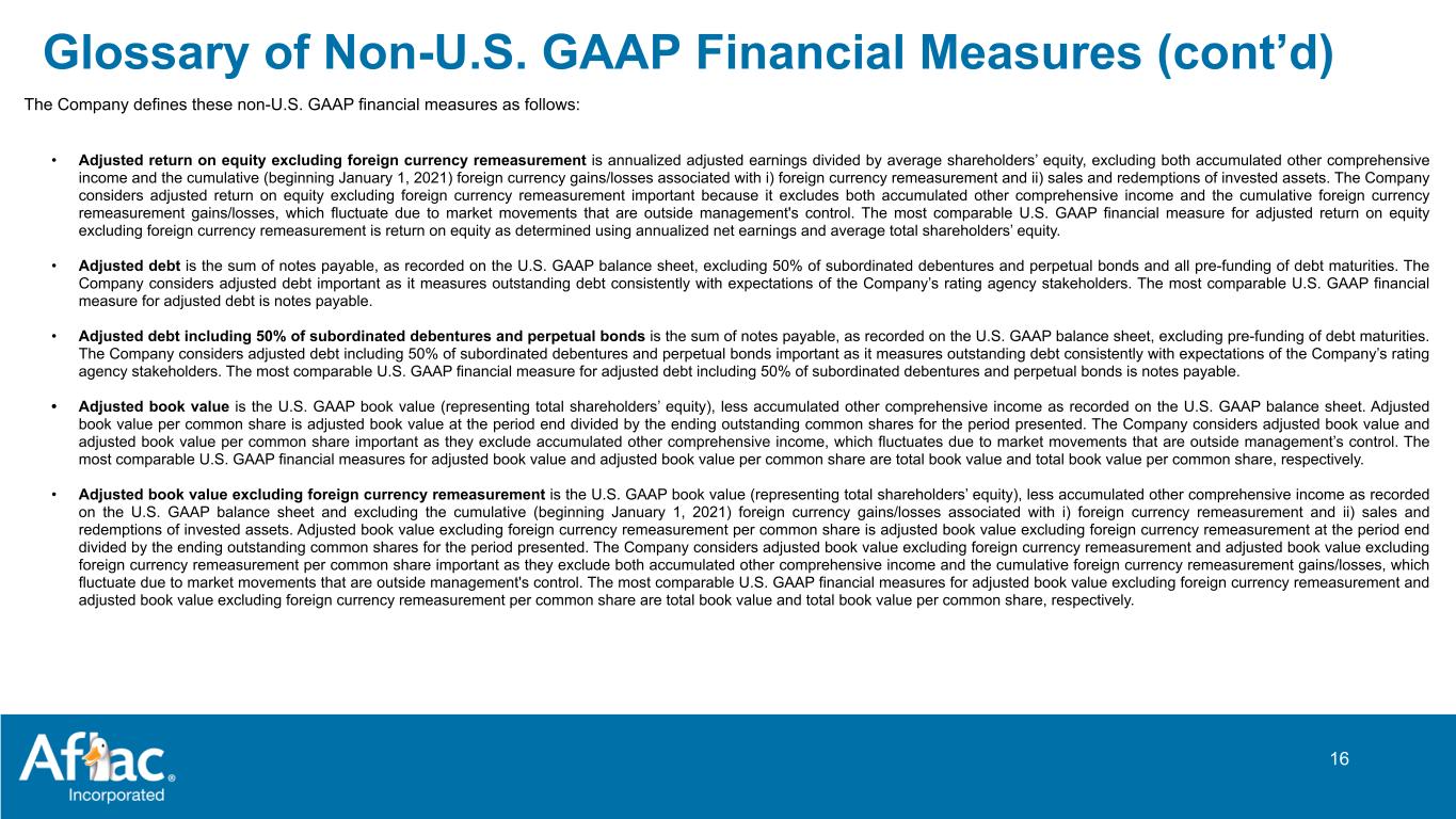 Glossary of Non-U.S. GAAP Financial Measures The Company defines these non-U.S. GAAP financial measures as follows: • Adjusted earnings are adjusted revenues less benefits and adjusted expenses. Adjusted earnings per share (basic or diluted) are the adjusted earnings for the period divided by the weighted average outstanding shares (basic or diluted) for the period presented. The adjustments to both revenues and expenses account for certain items that are outside of management’s control because they tend to be driven by general economic conditions and events or are related to infrequent activities not directly associated with insurance operations. Adjusted revenues are U.S. GAAP total revenues excluding adjusted net investment gains and losses. Adjusted expenses are U.S. GAAP total acquisition and operating expenses including the impact of interest from derivatives associated with notes payable but excluding any non-recurring or other items not associated with the normal course of the Company’s insurance operations and that do not reflect the Company's underlying business performance. Management uses adjusted earnings and adjusted earnings per diluted share to evaluate the financial performance of the Company’s insurance operations on a consolidated basis and believes that a presentation of these financial measures is vitally important to an understanding of the underlying profitability drivers and trends of the Company’s insurance business. The most comparable U.S. GAAP financial measures for adjusted earnings and adjusted earnings per share (basic or diluted) are net earnings and net earnings per share, respectively. • Adjusted net investment gains and losses are net investment gains and losses adjusted for i) amortized hedge cost/income related to foreign currency exposure management strategies and certain derivative activity, ii) net interest income/expense from foreign currency and interest rate derivatives associated with certain investment strategies, which are both reclassified to net investment income, and iii) the impact of interest from derivatives associated with notes payable, which is reclassified to interest expense as a component of total adjusted expenses. The Company considers adjusted net investment gains and losses important as it represents the remainder amount that is considered outside management’s control, while excluding the components that are within management’s control and are accordingly reclassified to net investment income and interest expense. The most comparable U.S. GAAP financial measure for adjusted net investment gains and losses is net investment gains and losses. • Adjusted earnings excluding current period foreign currency impact are computed using the average foreign exchange rate for the comparable prior-year period, which eliminates fluctuations driven solely by foreign exchange rate changes. Adjusted earnings per diluted share excluding current period foreign currency impact is adjusted earnings excluding current period foreign currency impact divided by the weighted average outstanding diluted shares for the period presented. The Company considers adjusted earnings excluding current period foreign currency impact and adjusted earnings per diluted share excluding current period foreign currency impact important because a significant portion of the Company's business is conducted in Japan and foreign exchange rates are outside management’s control; therefore, the Company believes it is important to understand the impact of translating foreign currency (primarily Japanese yen) into U.S. dollars. The most comparable U.S. GAAP financial measures for adjusted earnings excluding current period foreign currency impact and adjusted earnings per diluted share excluding current period foreign currency impact are net earnings and net earnings per share, respectively. • Adjusted return on equity is annualized adjusted earnings divided by average shareholders’ equity, excluding accumulated other comprehensive income. Management uses adjusted return on equity to evaluate the financial performance of the Company’s insurance operations on a consolidated basis and believes that a presentation of this financial measure is vitally important to an understanding of the underlying profitability drivers and trends of the Company’s insurance business. The Company considers adjusted return on equity important as it excludes components of accumulated other comprehensive income, which fluctuate due to market movements that are outside management's control. The most comparable U.S. GAAP financial measure for adjusted return on equity is return on equity as determined using annualized net earnings and average total shareholders’ equity. 15