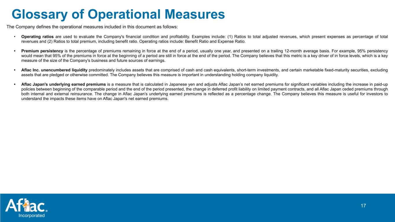 Glossary of Operational Measures The Company defines the operational measures included in this document as follows: • Operating ratios are used to evaluate the Company's financial condition and profitability. Examples include: (1) Ratios to total adjusted revenues, which present expenses as percentage of total revenues and (2) Ratios to total premium, including benefit ratio. Operating ratios include: Benefit Ratio and Expense Ratio. • Premium persistency is the percentage of premiums remaining in force at the end of a period, usually one year, and presented on a trailing 12-month average basis. For example, 95% persistency would mean that 95% of the premiums in force at the beginning of a period are still in force at the end of the period. The Company believes that this metric is a key driver of in force levels, which is a key measure of the size of the Company's business and future sources of earnings. • Aflac Inc. unencumbered liquidity predominately includes assets that are comprised of cash and cash equivalents, short-term investments, and certain marketable fixed-maturity securities, excluding assets that are pledged or otherwise committed. The Company believes this measure is important in understanding holding company liquidity. • Aflac Japan's underlying earned premiums is a measure that is calculated in Japanese yen and adjusts Aflac Japan’s net earned premiums for significant variables including the increase in paid-up policies between beginning of the comparable period and the end of the period presented, the change in deferred profit liability on limited payment contracts, and all Aflac Japan ceded premiums through both internal and external reinsurance. The change in Aflac Japan’s underlying earned premiums is reflected as a percentage change. The Company believes this measure is useful for investors to understand the impacts these items have on Aflac Japan's net earned premiums. 17