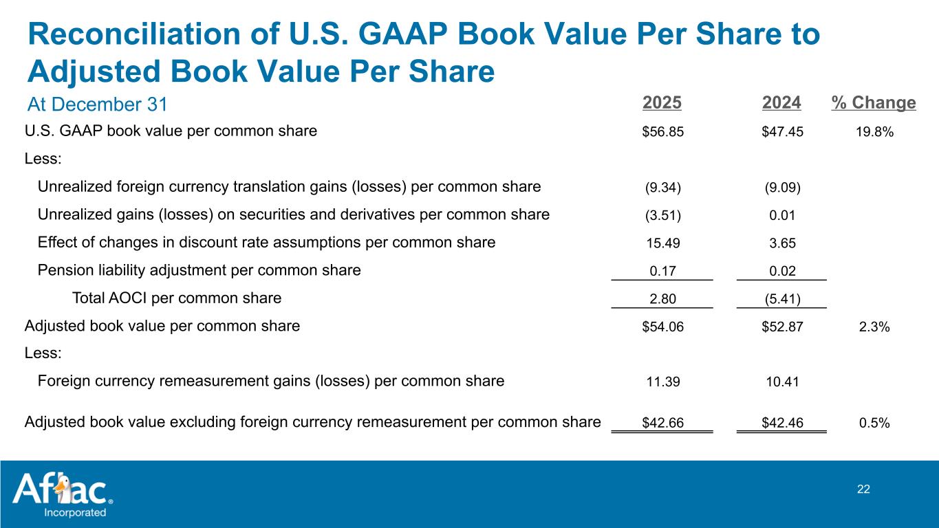 Reconciliation of U.S. GAAP Book Value Per Share to Adjusted Book Value Per Share At December 31 2025 2024 % Change U.S. GAAP book value per common share $56.85 $47.45 19.8% Less: Unrealized foreign currency translation gains (losses) per common share (9.34) (9.09) Unrealized gains (losses) on securities and derivatives per common share (3.51) 0.01 Effect of changes in discount rate assumptions per common share 15.49 3.65 Pension liability adjustment per common share 0.17 0.02 Total AOCI per common share 2.80 (5.41) Adjusted book value per common share $54.06 $52.87 2.3% Less: Foreign currency remeasurement gains (losses) per common share 11.39 10.41 Adjusted book value excluding foreign currency remeasurement per common share $42.66 $42.46 0.5% 22