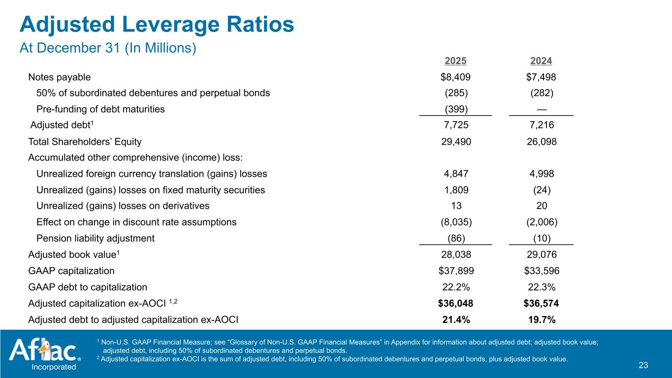 Adjusted Leverage Ratios At December 31 (In Millions) 2025 2024 Notes payable $8,409 $7,498 50% of subordinated debentures and perpetual bonds (285) (282) Pre-funding of debt maturities (399) — Adjusted debt1 7,725 7,216 Total Shareholders’ Equity 29,490 26,098 Accumulated other comprehensive (income) loss: Unrealized foreign currency translation (gains) losses 4,847 4,998 Unrealized (gains) losses on fixed maturity securities 1,809 (24) Unrealized (gains) losses on derivatives 13 20 Effect on change in discount rate assumptions (8,035) (2,006) Pension liability adjustment (86) (10) Adjusted book value1 28,038 29,076 GAAP capitalization $37,899 $33,596 GAAP debt to capitalization 22.2% 22.3% Adjusted capitalization ex-AOCI 1,2 $36,048 $36,574 Adjusted debt to adjusted capitalization ex-AOCI 21.4% 19.7% 1 Non-U.S. GAAP Financial Measure; see “Glossary of Non-U.S. GAAP Financial Measures” in Appendix for information about adjusted debt; adjusted book value; adjusted debt, including 50% of subordinated debentures and perpetual bonds. 2 Adjusted capitalization ex-AOCI is the sum of adjusted debt, including 50% of subordinated debentures and perpetual bonds, plus adjusted book value. 23