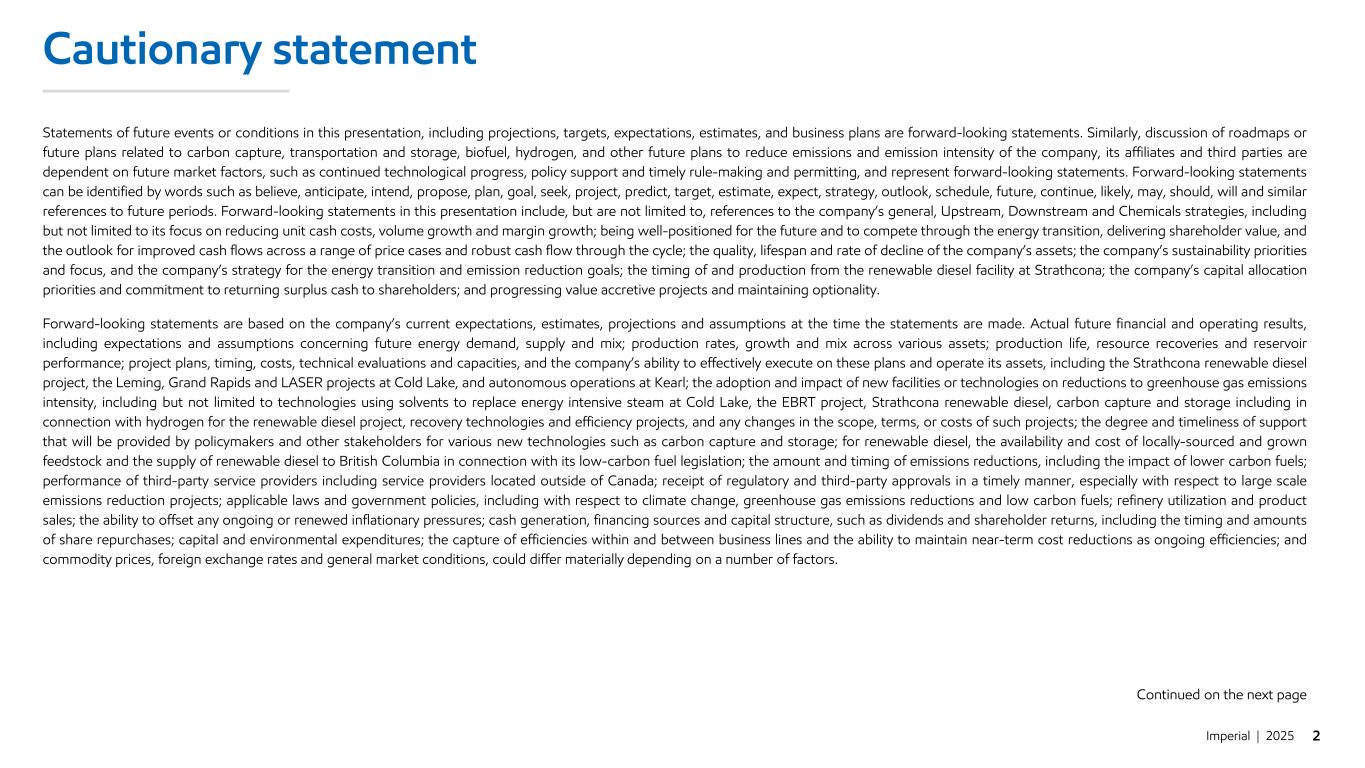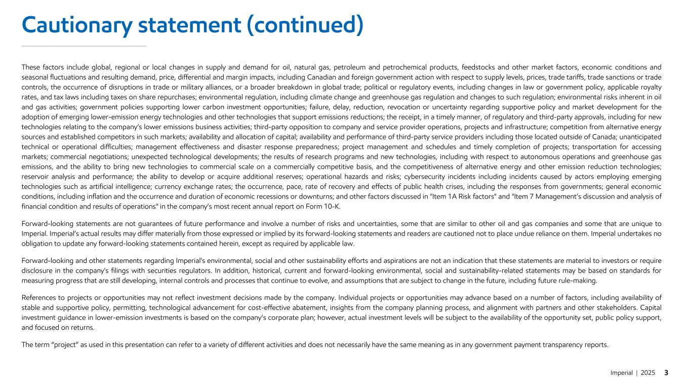 Imperial | 2025 2 Cautionary statement Statements of future events or conditions in this presentation, including projections, targets, expectations, estimates, and business plans are forward-looking statements. Similarly, discussion of roadmaps or future plans related to carbon capture, transportation and storage, biofuel, hydrogen, and other future plans to reduce emissions and emission intensity of the company, its affiliates and third parties are dependent on future market factors, such as continued technological progress, policy support and timely rule-making and permitting, and represent forward-looking statements. Forward-looking statements can be identified by words such as believe, anticipate, intend, propose, plan, goal, seek, project, predict, target, estimate, expect, strategy, outlook, schedule, future, continue, likely, may, should, will and similar references to future periods. Forward-looking statements in this presentation include, but are not limited to, references to the company’s general, Upstream, Downstream and Chemicals strategies, including but not limited to its focus on reducing unit cash costs, volume growth and margin growth; being well-positioned for the future and to compete through the energy transition, delivering shareholder value, and the outlook for improved cash flows across a range of price cases and robust cash flow through the cycle; the quality, lifespan and rate of decline of the company’s assets; the company’s sustainability priorities and focus, and the company’s strategy for the energy transition and emission reduction goals; the timing of and production from the renewable diesel facility at Strathcona; the company’s capital allocation priorities and commitment to returning surplus cash to shareholders; and progressing value accretive projects and maintaining optionality. Forward-looking statements are based on the company’s current expectations, estimates, projections and assumptions at the time the statements are made. Actual future financial and operating results, including expectations and assumptions concerning future energy demand, supply and mix; production rates, growth and mix across various assets; production life, resource recoveries and reservoir performance; project plans, timing, costs, technical evaluations and capacities, and the company’s ability to effectively execute on these plans and operate its assets, including the Strathcona renewable diesel project, the Leming, Grand Rapids and LASER projects at Cold Lake, and autonomous operations at Kearl; the adoption and impact of new facilities or technologies on reductions to greenhouse gas emissions intensity, including but not limited to technologies using solvents to replace energy intensive steam at Cold Lake, the EBRT project, Strathcona renewable diesel, carbon capture and storage including in connection with hydrogen for the renewable diesel project, recovery technologies and efficiency projects, and any changes in the scope, terms, or costs of such projects; the degree and timeliness of support that will be provided by policymakers and other stakeholders for various new technologies such as carbon capture and storage; for renewable diesel, the availability and cost of locally-sourced and grown feedstock and the supply of renewable diesel to British Columbia in connection with its low-carbon fuel legislation; the amount and timing of emissions reductions, including the impact of lower carbon fuels; performance of third-party service providers including service providers located outside of Canada; receipt of regulatory and third-party approvals in a timely manner, especially with respect to large scale emissions reduction projects; applicable laws and government policies, including with respect to climate change, greenhouse gas emissions reductions and low carbon fuels; refinery utilization and product sales; the ability to offset any ongoing or renewed inflationary pressures; cash generation, financing sources and capital structure, such as dividends and shareholder returns, including the timing and amounts of share repurchases; capital and environmental expenditures; the capture of efficiencies within and between business lines and the ability to maintain near-term cost reductions as ongoing efficiencies; and commodity prices, foreign exchange rates and general market conditions, could differ materially depending on a number of factors. Continued on the next page