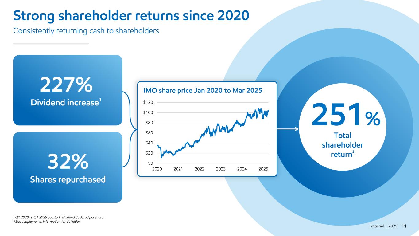 Imperial | 2025 10 Strong shareholder returns in 2024 Effectively returning cash to shareholders 20% $1.2B Dividends paid $2.7B Share buybacks 2024 total shareholder return¹ 1 See supplemental information for definition $0 $20 $40 $60 $80 $100 $120 IMO share price Jan 2024 to Mar 2025 Q1 Q2 Q3 Q4 Q1