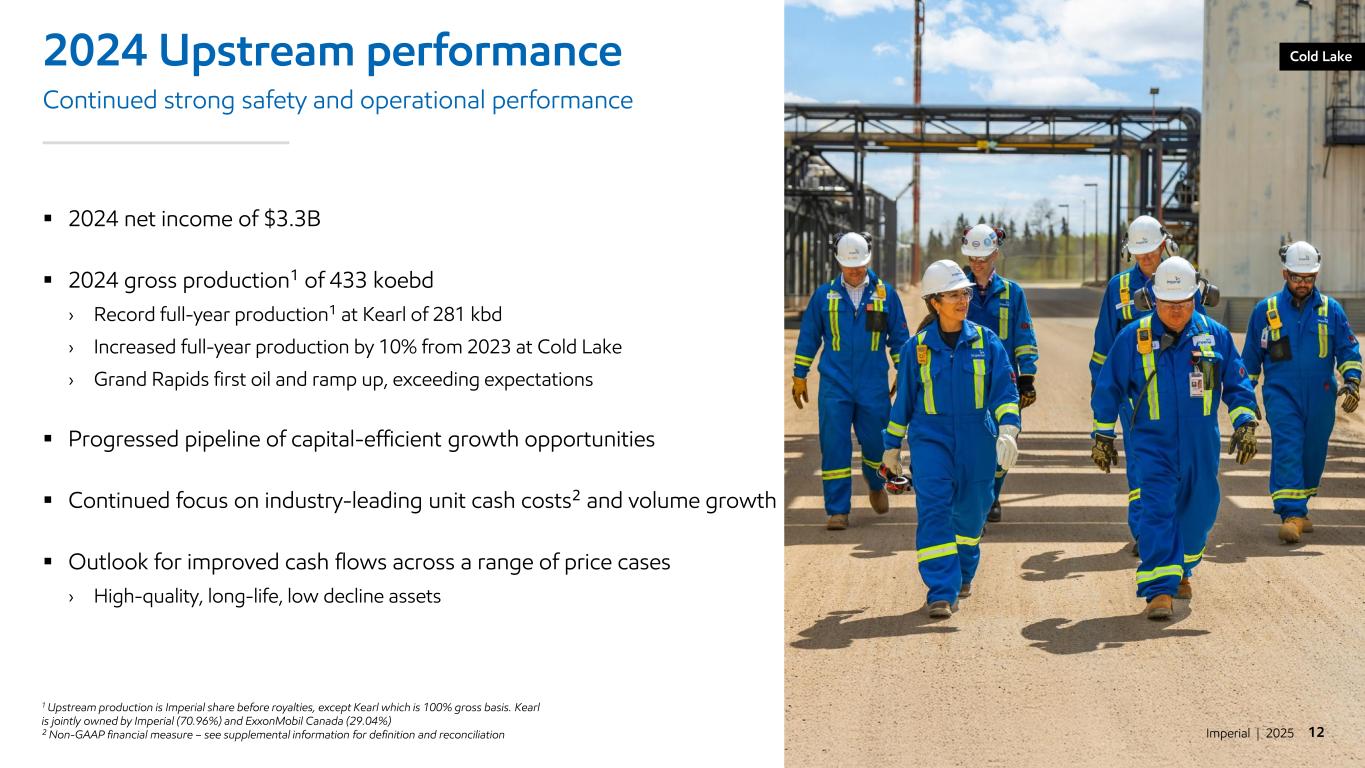 Imperial | 2025 11 Strong shareholder returns since 2020 Consistently returning cash to shareholders 227% Dividend increase¹ 32% Shares repurchased 251% Total shareholder return² 1 Q1 2020 vs Q1 2025 quarterly dividend declared per share ² See supplemental information for definition $0 $20 $40 $60 $80 $100 $120 2020 2021 2022 2023 2024 2025 IMO share price Jan 2020 to Mar 2025