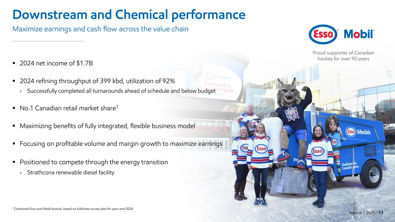 Imperial | 2025 12 2024 Upstream performance Continued strong safety and operational performance ▪ 2024 net income of $3.3B ▪ 2024 gross production¹ of 433 koebd › Record full-year production¹ at Kearl of 281 kbd › Increased full-year production by 10% from 2023 at Cold Lake › Grand Rapids first oil and ramp up, exceeding expectations ▪ Progressed pipeline of capital-efficient growth opportunities ▪ Continued focus on industry-leading unit cash costs² and volume growth ▪ Outlook for improved cash flows across a range of price cases › High-quality, long-life, low decline assets Cold Lake 1 Upstream production is Imperial share before royalties, except Kearl which is 100% gross basis. Kearl is jointly owned by Imperial (70.96%) and ExxonMobil Canada (29.04%) ² Non-GAAP financial measure – see supplemental information for definition and reconciliation