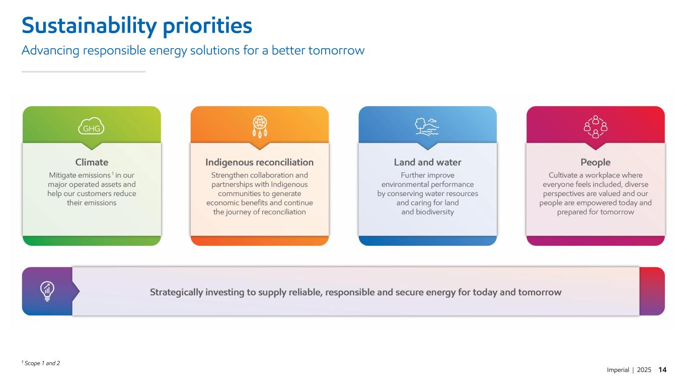 Imperial | 2025 13 Downstream and Chemical performance Maximize earnings and cash flow across the value chain 1 Combined Esso and Mobil brands, based on Kalibrate survey data for year-end 2024 Proud supporter of Canadian hockey for over 90 years ▪ 2024 net income of $1.7B ▪ 2024 refining throughput of 399 kbd, utilization of 92% › Successfully completed all turnarounds ahead of schedule and below budget ▪ No.1 Canadian retail market share¹ ▪ Maximizing benefits of fully integrated, flexible business model ▪ Focusing on profitable volume and margin growth to maximize earnings ▪ Positioned to compete through the energy transition › Strathcona renewable diesel facility