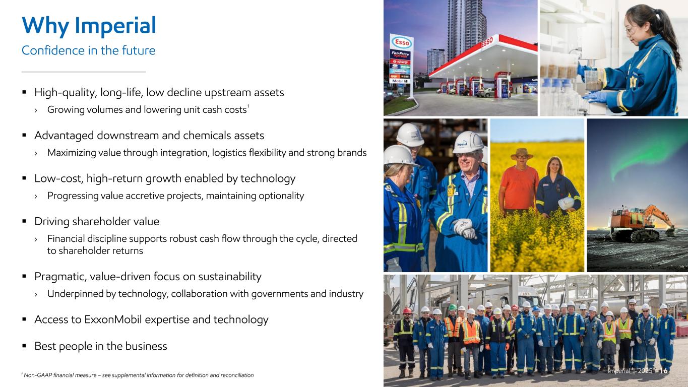 Imperial | 2025 15 Capital allocation priorities Committed to returning surplus cash to shareholders ▪ Reliable and growing dividend › 30 years of consecutive increases › 23% dividend CAGR¹ over past 5 years ▪ Low sustaining capital requirements ▪ High-return capital-efficient investments in core assets ▪ Return surplus cash to shareholders › Repurchased 39% of outstanding shares since 2018 ▪ Optionality to invest in highly attractive opportunities 0 300 600 900 2017 2018 2019 2020 2021 2022 2023 2024 Shares outstanding Millons of shares 1 Compound annual growth rate $0 $2 $4 $6 $8 2020 2021 2022 2023 2024 Q1 2025 Dividends Buybacks $B Annual cash distributions