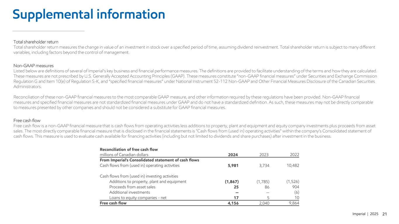 Imperial | 2025 Supplemental information Total shareholder return Total shareholder return measures the change in value of an investment in stock over a specified period of time, assuming dividend reinvestment. Total shareholder return is subject to many different variables, including factors beyond the control of management. Non-GAAP measures Listed below are definitions of several of Imperial’s key business and financial performance measures. The definitions are provided to facilitate understanding of the terms and how they are calculated. These measures are not prescribed by U.S. Generally Accepted Accounting Principles (GAAP). These measures constitute “non-GAAP financial measures” under Securities and Exchange Commission Regulation G and Item 10(e) of Regulation S-K, and “specified financial measures” under National Instrument 52-112 Non-GAAP and Other Financial Measures Disclosure of the Canadian Securities Administrators. Reconciliation of these non-GAAP financial measures to the most comparable GAAP measure, and other information required by these regulations have been provided. Non-GAAP financial measures and specified financial measures are not standardized financial measures under GAAP and do not have a standardized definition. As such, these measures may not be directly comparable to measures presented by other companies and should not be considered a substitute for GAAP financial measures. Free cash flow Free cash flow is a non-GAAP financial measure that is cash flows from operating activities less additions to property, plant and equipment and equity company investments plus proceeds from asset sales. The most directly comparable financial measure that is disclosed in the financial statements is "Cash flows from (used in) operating activities" within the company’s Consolidated statement of cash flows. This measure is used to evaluate cash available for financing activities (including but not limited to dividends and share purchases) after investment in the business. Reconciliation of free cash flow millions of Canadian dollars 2024 2023 2022 From Imperial's Consolidated statement of cash flows Cash flows from (used in) operating activities 5,981 3,734 10,482 Cash flows from (used in) investing activities Additions to property, plant and equipment (1,867) (1,785) (1,526) Proceeds from asset sales 25 86 904 Additional investments — — (6) Loans to equity companies - net 17 5 10 Free cash flow 4,156 2,040 9,864